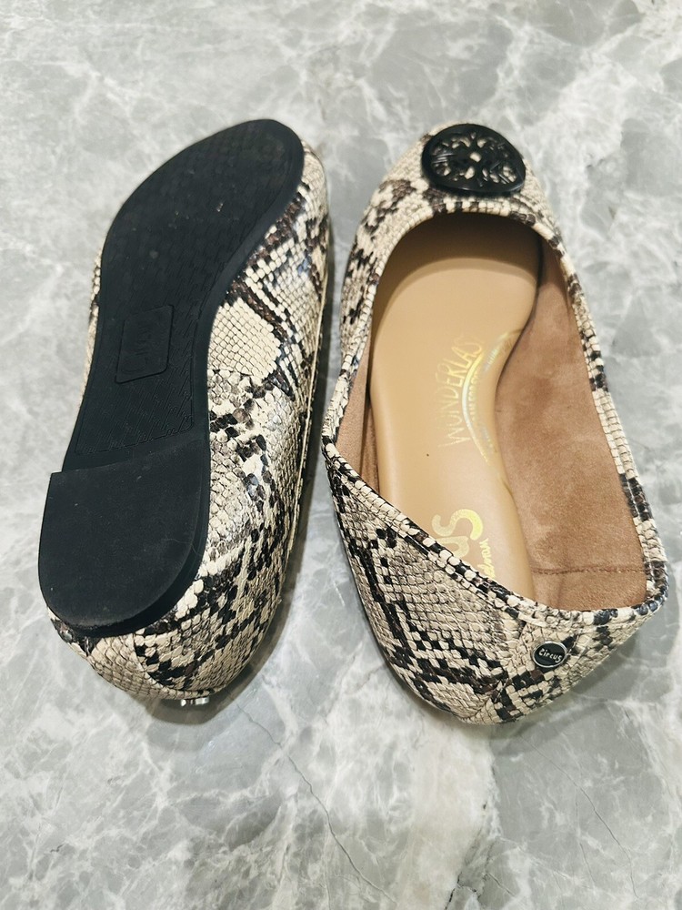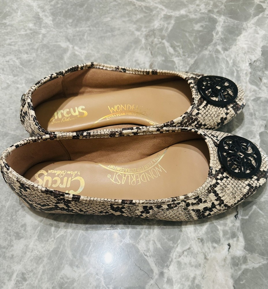 The Circus by Sam Edelman Colleen Snake Print Skimmer Ballet Flats are a pair of women's shoes that feature a snake print pattern, a round toe shape, and a slip-on closure. They are made of synthetic upper and lining material, and have a rubber outsole. The flats are designed with a bow, sequin, and logo accents, and have a medallion on the toe. They are lightweight, cushioned, and have a memory foam insole. The flats are breathable and padded, making them comfortable for travel, casual, and business occasions.