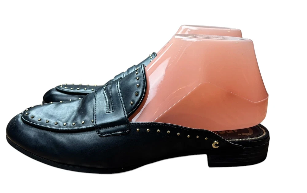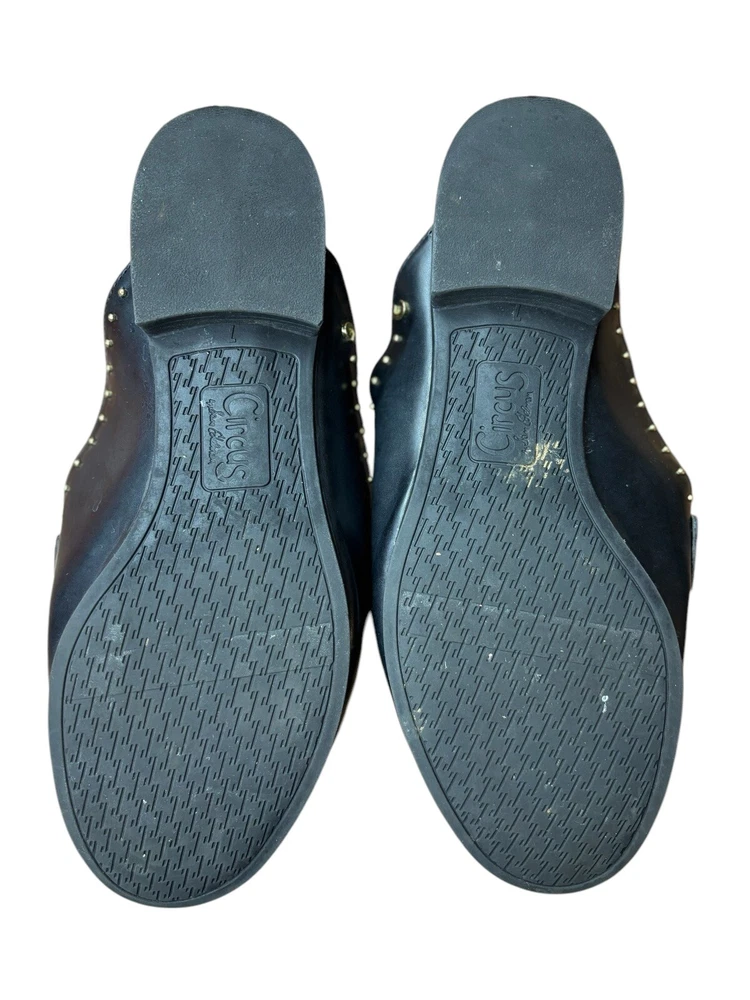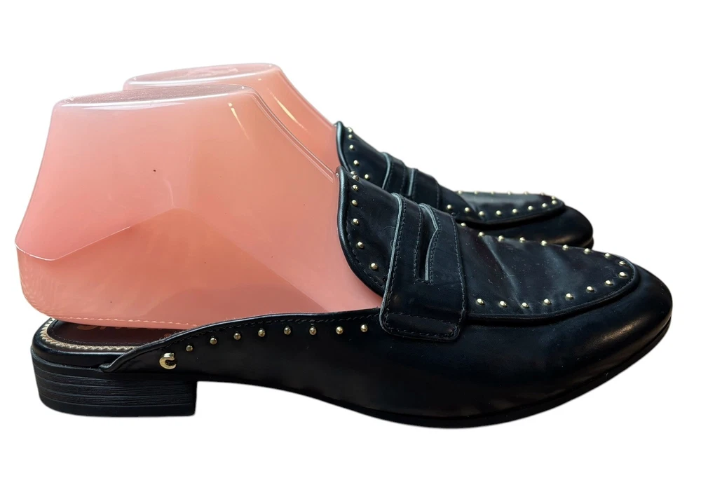 Circus by Sam Edelman Women's Hanlon Mule is a stylish and versatile loafer in a sleek black color, featuring studded accents for a touch of edgy flair. These slip-on flats are designed for comfort, with a synthetic lining and insole, and a rubber outsole for durability. Perfect for casual or business occasions, they are crafted from faux leather and come in a US shoe size 7 (EU size 37). Ideal for summer, fall, and spring seasons, these loafers offer a chic and practical footwear option for women.