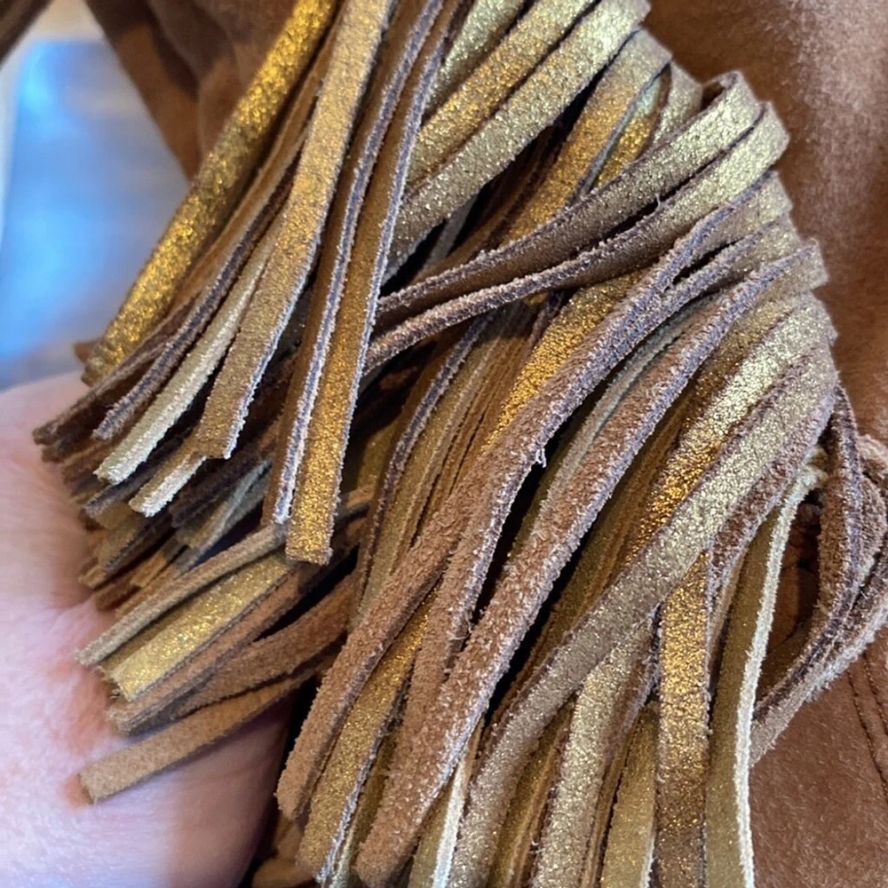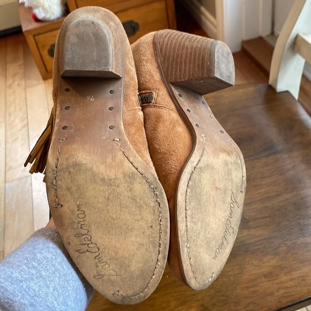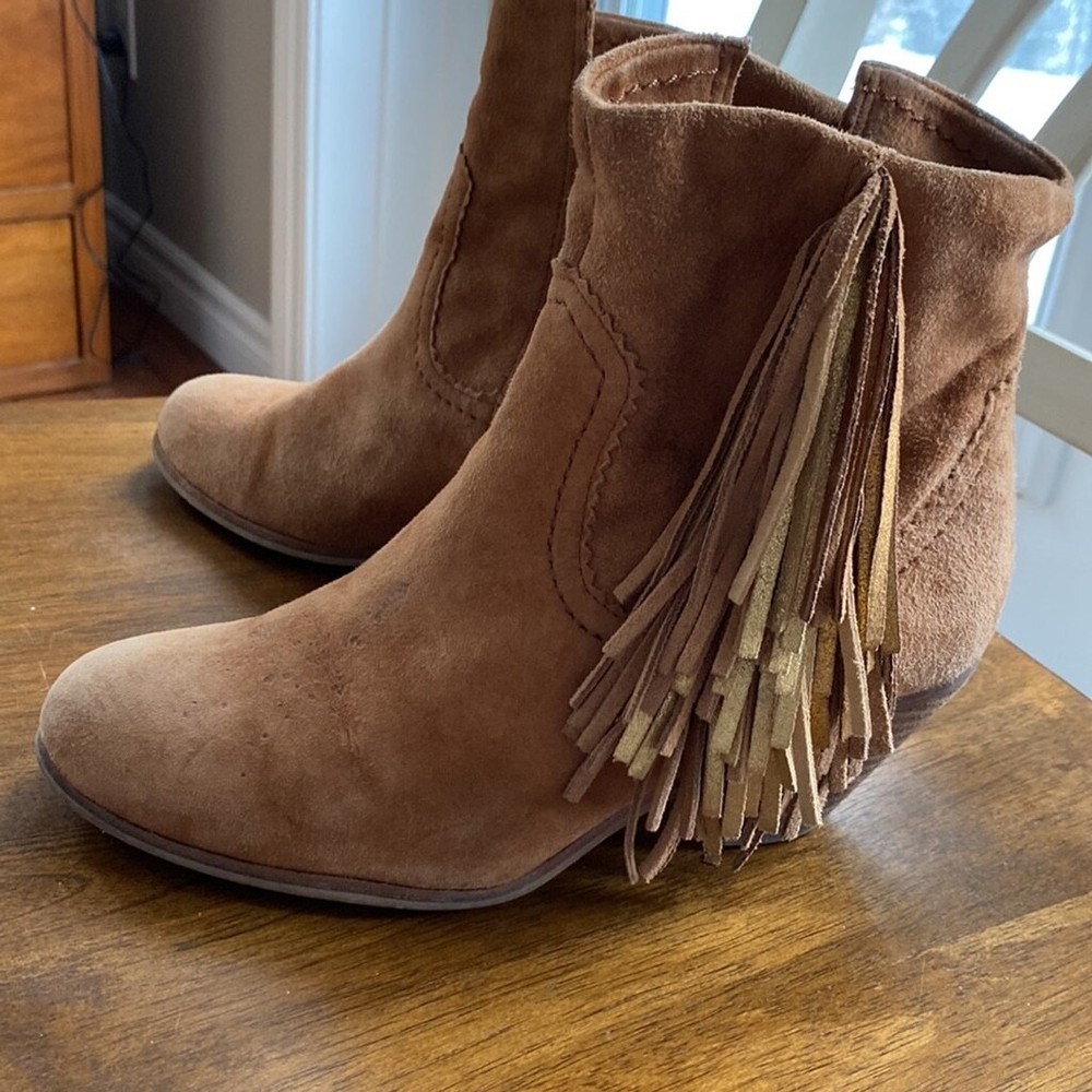 Sam Edelman Louie Western Boot Caramel Brown Suede Fringe US Size 7.5 Block Heel Super soft Heels and soles in very good condition Some little spots on one toe - noticeable close up Zippered- one inner zip is torn but doesn’t affect closure or look