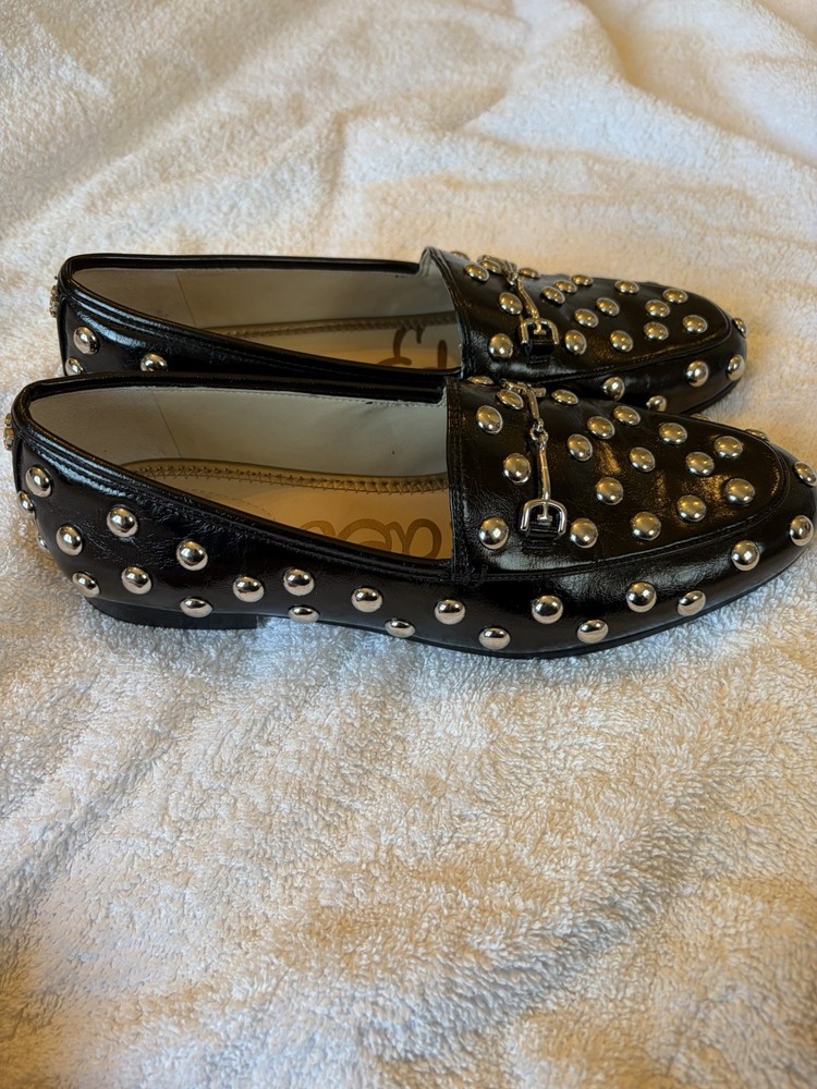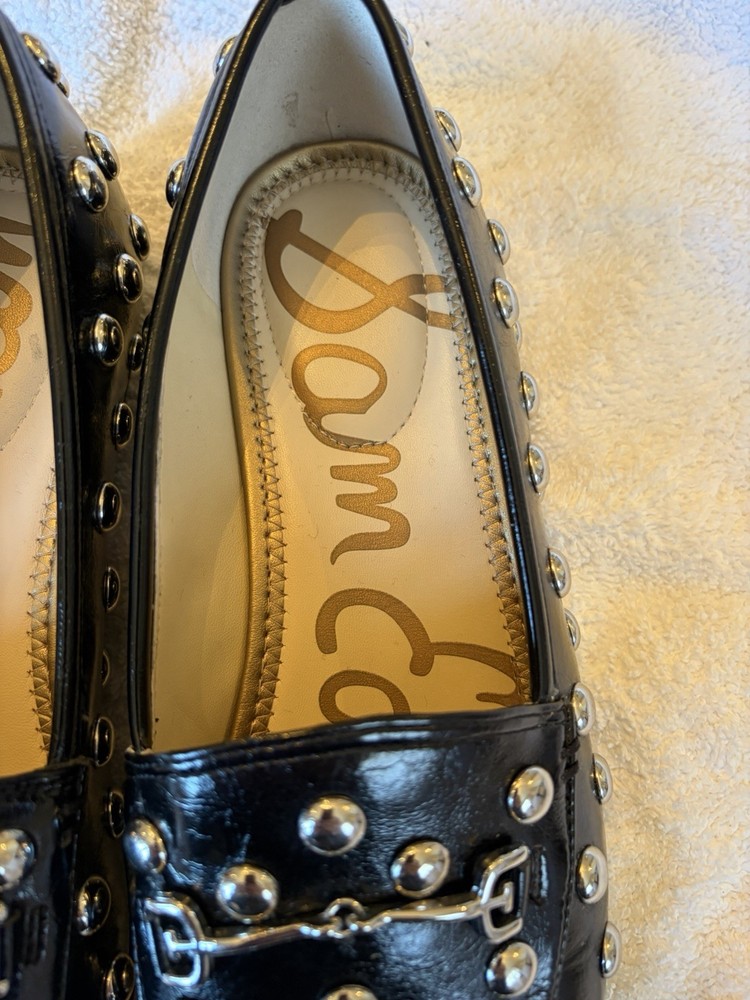 The Sam Edelman Studded Black Loafer with Horse Bit Detail is a stylish and versatile shoe for women in size 7.5. This slip-on loafer features a solid black color with silver studded accents, giving it a a classic, but also edgy look. The horse bit detail adds a touch of sophistication to this simple yet chic shoe from a reputable brand like Sam Edelman. Used, but in excellent condition. Smoke free home.