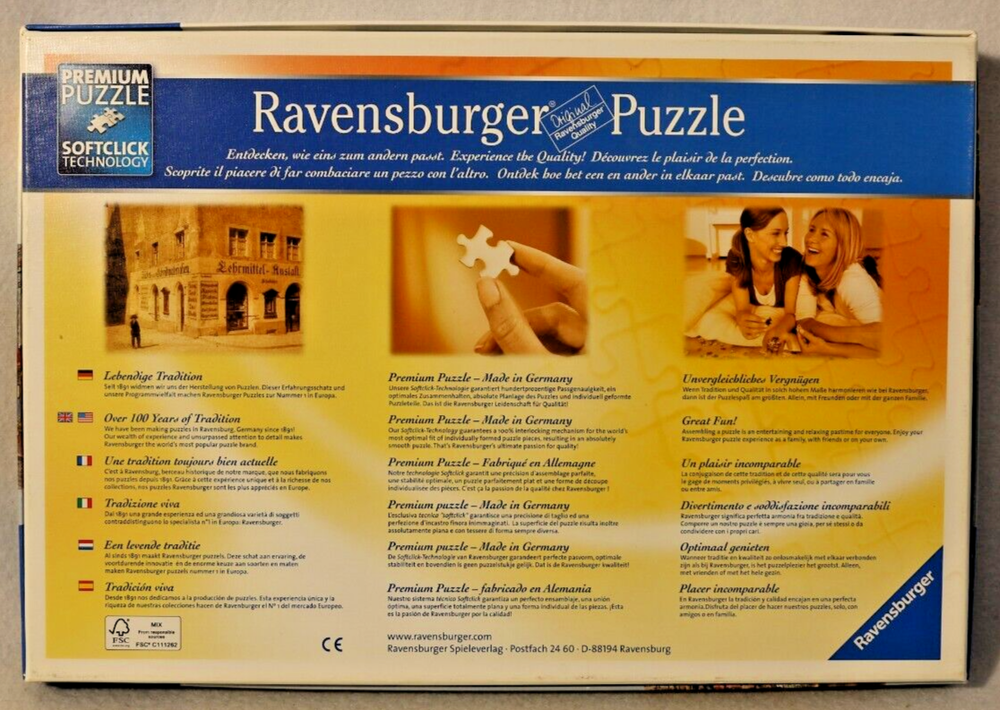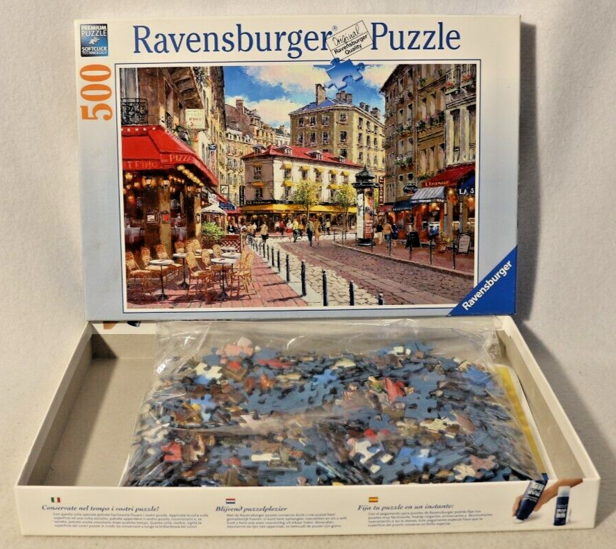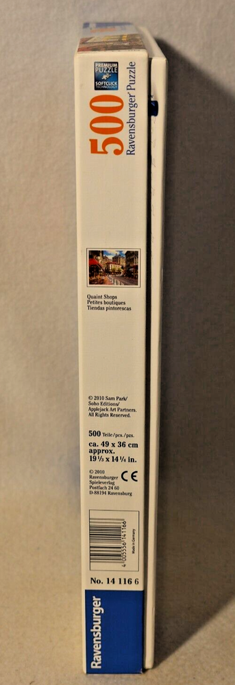 This 500 piece jigsaw puzzle by Ravensburger features the beautiful artwork of Sam Park, depicting a charming city scene filled with quaint shops. Made from high-quality cardboard, the puzzle pieces interlock perfectly to create a charming finished product. The puzzle is complete and comes from a smoke-free home. Recommended for ages 10 and up, this puzzle is a great way to spend time with family or friends. Made in Germany, this puzzle is sure to provide hours of entertainment for puzzle enthusiasts of all ages. Doing puzzles has some hidden benefits . Excellent qualities : Cultivate concentration, patience, and temper your will Movement development : Train hand-eye coordination and precise small movements Spatial intelligence : Improve visual discrimination of colors and shapes Critical thinking ability : Understand the relationship between parts and the whole, and draw inferences from one example to explore the future Relaxes your mind : Relieve work pressure and release yourself Brain development : Enhance memory and may help prevent or slow brain degeneration * We did not work the puzzle or count the pieces, but we verify the number count at your request . Puzzle pieces are all bagged. Each item we ship is carefully packaged to prevent any damage and is shipped immediately with tracking.