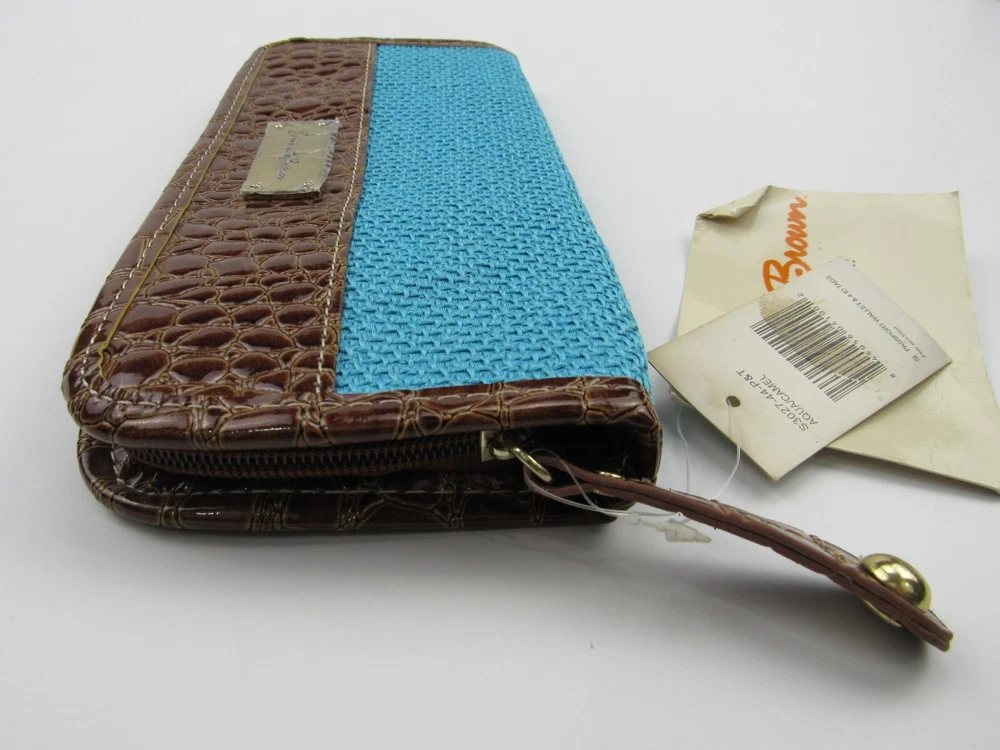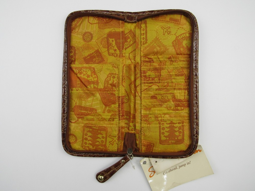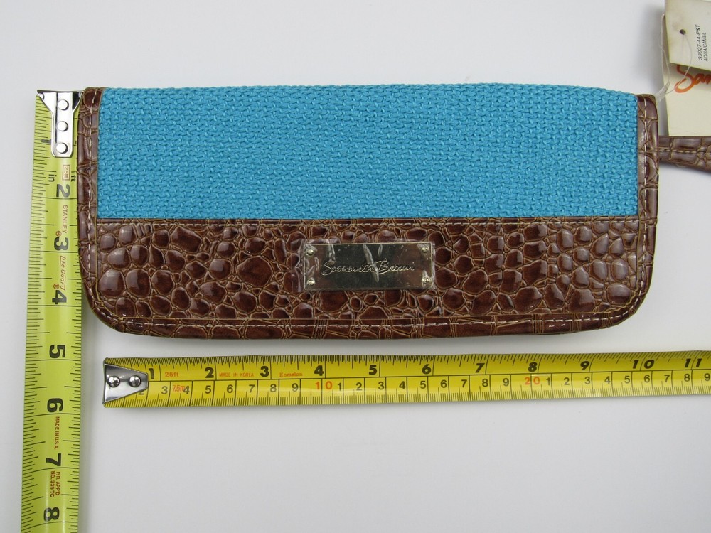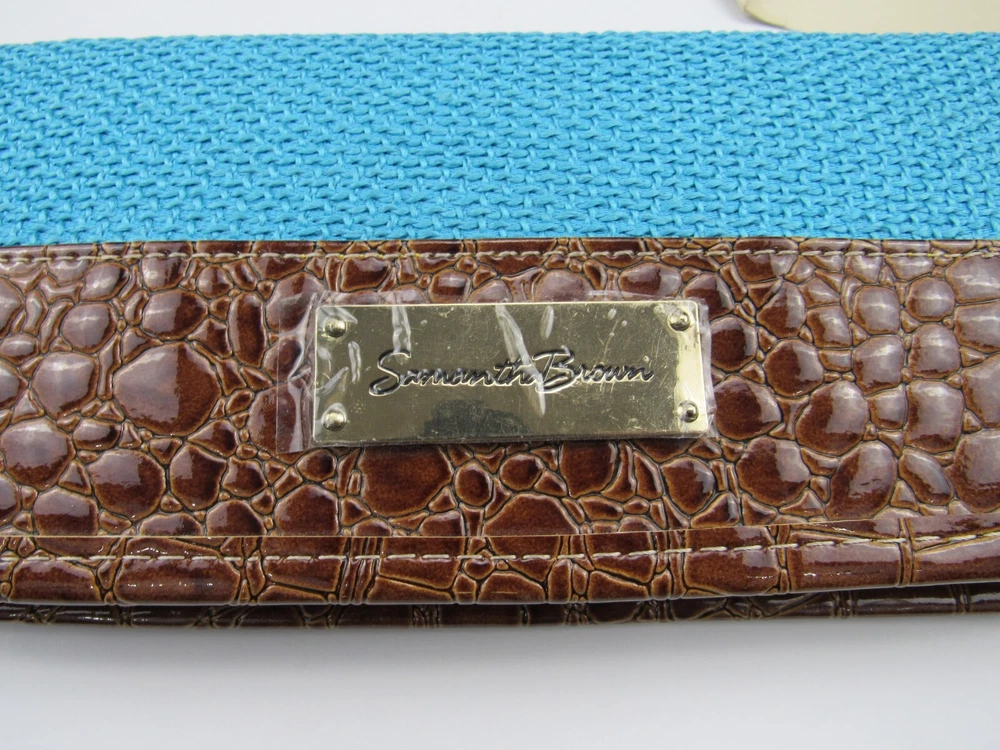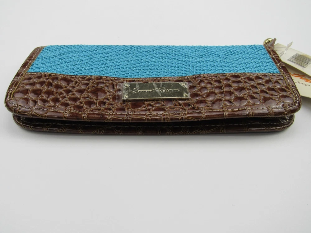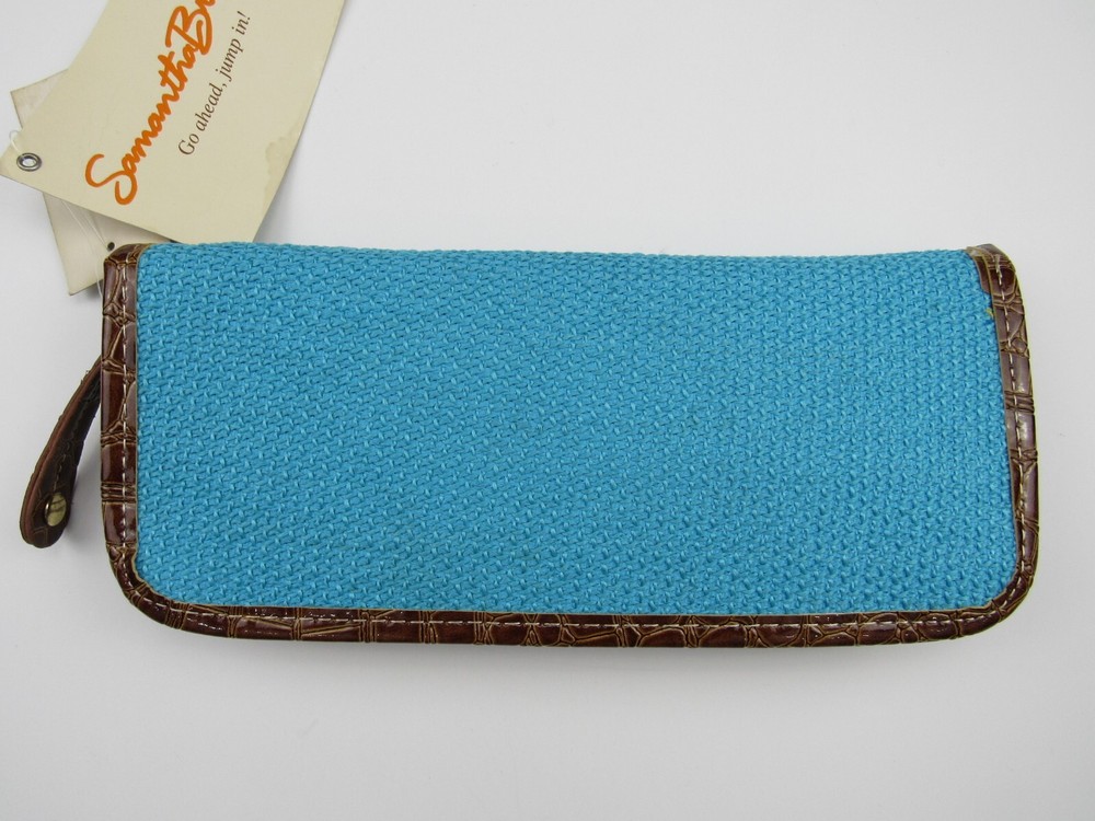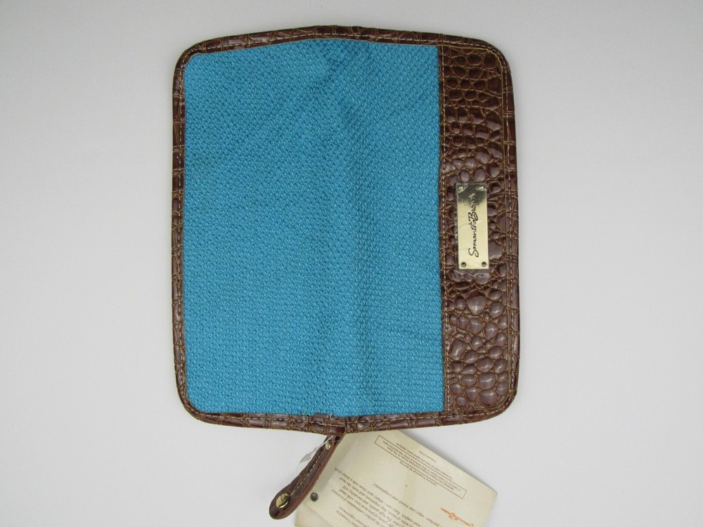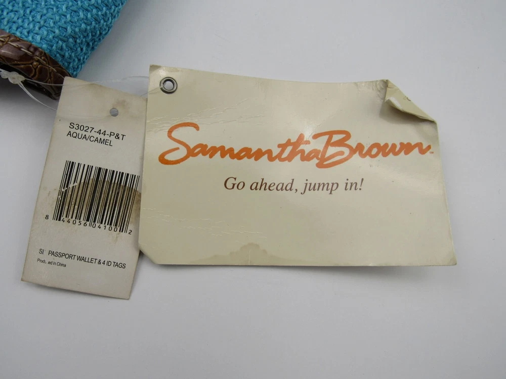 Deadstock New with tags, Samantha Brown zippered passport wallet organizer. Faux embossed crocodile and woven turquoise blue. Color is listed as Aqua/Camel. Holds passport, credit cards, ID's and pen holder. 55% cotton, 45% polyester, travel theme lining is 100% polyester. Measures approximately 4" X 10".
