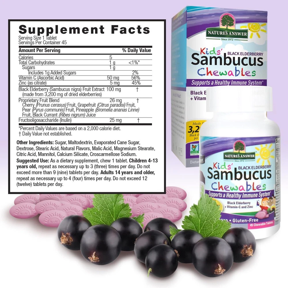 Nature’s Answer Sambucus Chewables for these aren’t just great-tasting chewable, they’re the ultimate in immune support. Nature’s Answer combines them all with Elderberry – Elderberry has more antioxidants than blackberries, cranberries, and Goji berries. Elderberry Chewable for is the complete great-tasting chewable with the antioxidant C, that your will love. Support your ’s immune with these great-tasting daily chewable, formulated with our standardized elderberry extract, , and C to support immune function. Sambucus Chewable are a perfect way to take elderberry on the go. These great-tasting can be chewed or allowed to dissolve slowly in your mouth. Provide the natural power of black elderberry and C to provide year-round immunity support. Product Features: Nature’s Answer Sambucus Chewables for these aren’t just great-tasting chewable, they’re the ultimate in immune support. Nature’s Answer combines them all with Elderberry – Elderberry has more antioxidants than blackberries, cranberries, and Goji berries. Elderberry Chewable for is the complete great-tasting chewable with the antioxidant C, that your will love. You’ll love knowing that it’s supporting their immune system through the challenges it faces every day. Give your the ultimate support. Gluten-Free, Vegan, and Non-GMO. Product Benefits: No artificial flavors or colors. Gluten, soy, dairy, nut and egg-free. Vegan and Vegetarian Product. Gluten-free Non-GMO Vegan No Artificial Preservatives or Flavors Cruelty-Free