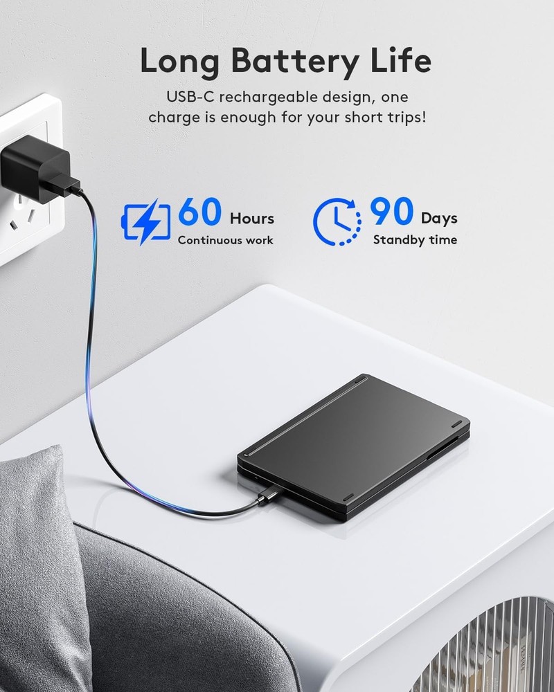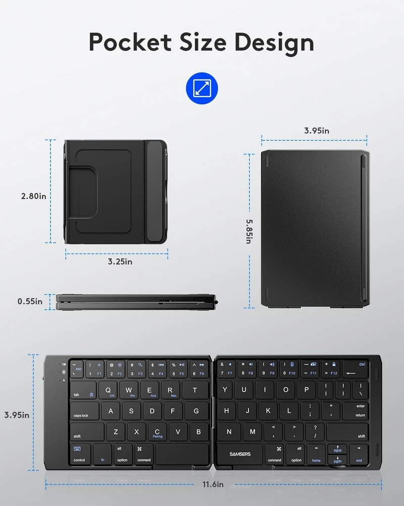 Samsers Foldable Bluetooth Keyboard Portable Folding BT x 1, Black Product Details Product Dimensions: 11.6 x 3.95 x 0.25 inches Item Weight: 10.2 ounces Manufacturer: Samsers Batteries: 1 Lithium Ion batteries required. (included) Brand: Samsers Compatible Devices: Laptop, PC, Tablet, Smartphone Connectivity Technology: Bluetooth Keyboard Description: Flexible Recommended Uses For Product: Everyday Use, Education, Business Special Feature: Portable, Lightweight, Hotkeys and Media Keys, Foldable Color: Black Number of Keys: 104 Style: Contemporary & Modern Product Dimensions: 11.6"L x 3.95"W x 0.25"H 【Foldable Portable Keyboard】Only 6.5-ounce palm-sized keyboard can be folded into your pocket or backpack to carry around. Quiet keys allow you to focus on your work. Standard-size design provides accurate, fast typing, just like the desktop keyboard you are used to. Maximum convenience for you with minimum weight and size! 【Compact Travel Keyboard】 Compact pocket size design to easily carry it with you. Magnetic lock keeps it closed while traveling. Auto-reconnect function allows automatic reconnection to the last connected device when turning on. Maintains a stable connection and provides fast response to devices within 10 meters of operating range. With Samsers folding keyboard, you can start writing down your thoughts, replying to emails, editing excel sheets quickly anywhere! 【Long Battery Life】Easily recharged via the included Type-C cable. Built-in large capacity battery can be used for 60 hours of continuous operation or 90 days of standby. One full charge last enough for your short business trip or vacation! 【Folding Bluetooth keyboard 】Comes with a foldable phone holder that transforms your tablet into a laptop in less than a second. 6 adjustable angles to meet your different viewing needs! Work or leisure when you go to different places like cafes offices or libraries~ 【Sincere Service】Samsers provides you with 24-hour email reply and lifetime technical support. If you have any questions, please feel free to contact us! ~ 【Warm tips】 After receiving the keyboard, please keyboard for 2 hours fully charged, the battery power will lead to abnormal battery function