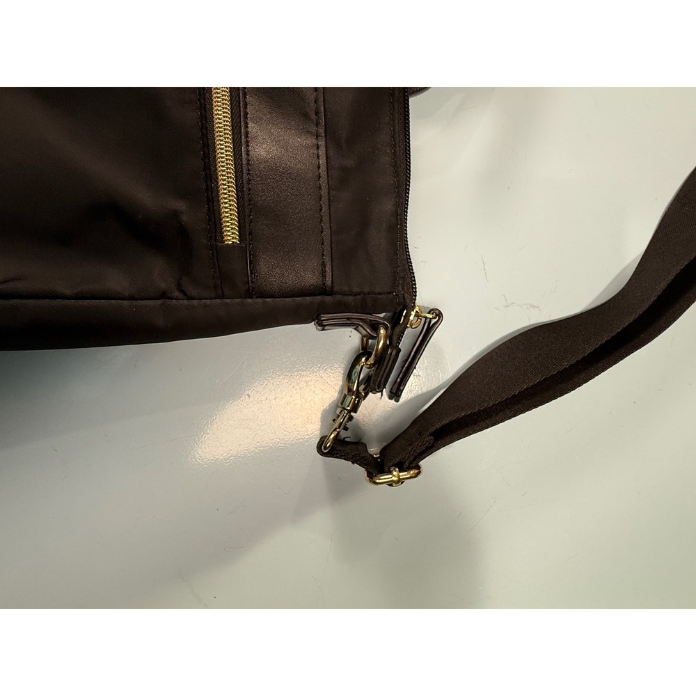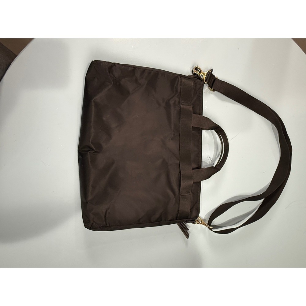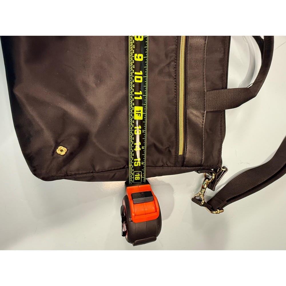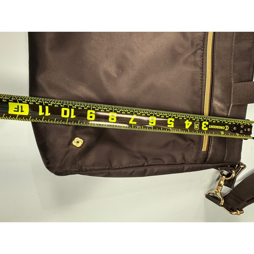 Samsonite laptop bag crafted from durable brown nylon with elegant gold-tone hardware. This versatile briefcase features a slim profile with a zippered front pocket and a luggage sleeve on the back for easy travel. The interior is lined in a contrasting light mauve fabric and includes multiple organizational compartments for a laptop and accessories. It offers flexible carrying options with double top handles and a removable, adjustable crossbody strap. Note that there is some visible staining on the interior lining as shown in the photos. Measurements: • Width: 15" • Height: 11" • Depth: 1"