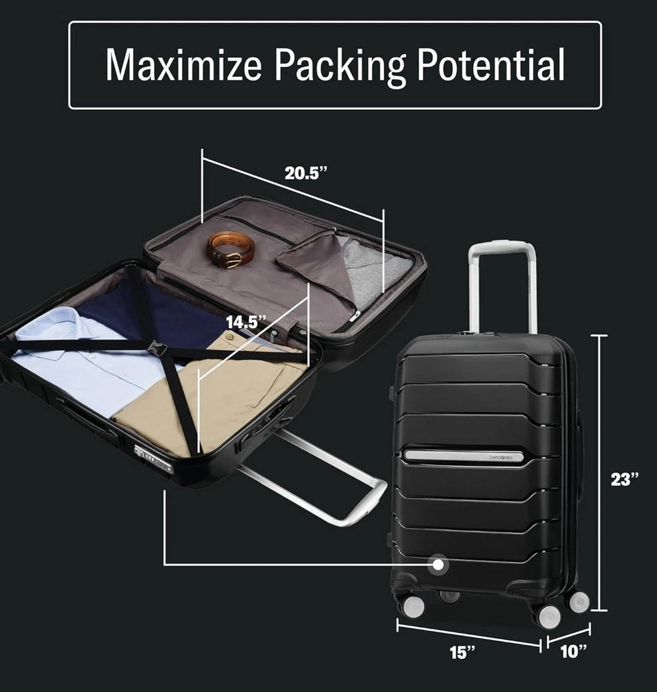 MPN:782551041Material:PolycarbonateGender:Unisex AdultUPC:0043202721359Color:BlackType:Carry-OnsFeatures:Top and Side Carry Handles, Lightweight Luggage, Spinner, Wheels/Rolling, Zip Pocket, LockingBrand:Samsonitegtin13:0043202721359Size:21"