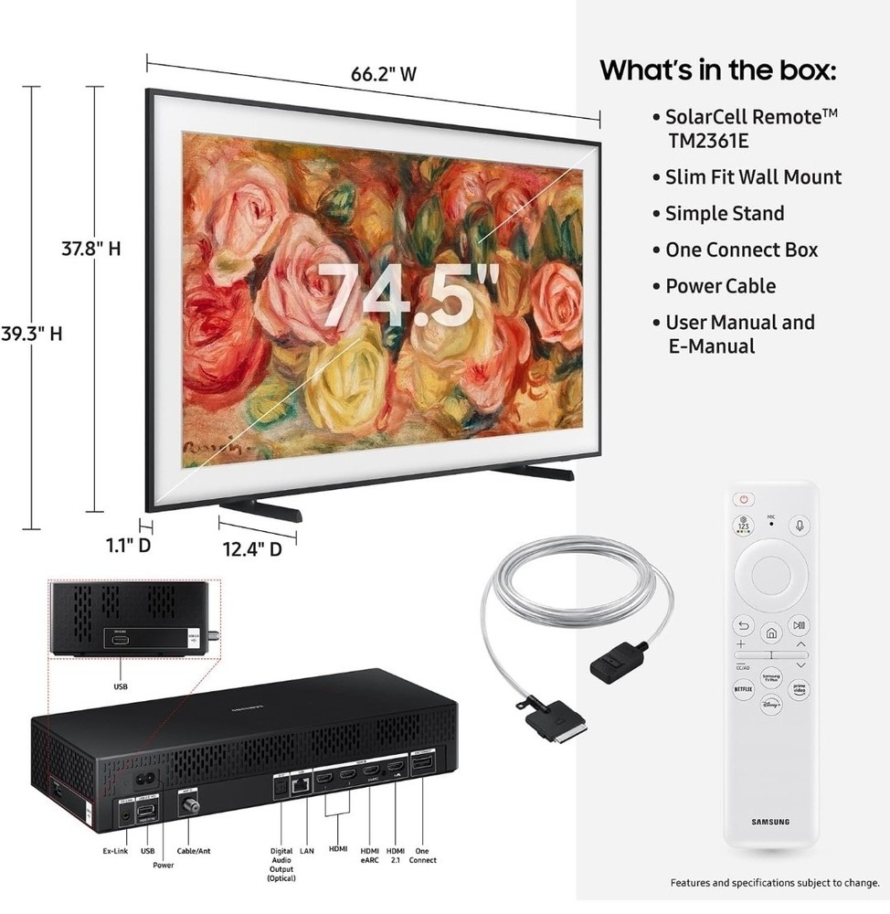 Selling TV as I recently upgraded. TV is in perfect condition and comes with Govee Envisual LED Backlight LEDs installed, illuminating the wall behind the TV. The LEDs are also reactive to what is on the screen. The Samsung The Frame 75-Inch TV is a cutting-edge television featuring 4K UHD Dual LED Quantum HDR technology for stunning picture quality. With Alexa Built-In, users can easily access a wide range of entertainment options and smart TV features. The TV also boasts a sleek design with a black color finish, perfect for any modern living space. Additionally, it includes various audio/video inputs and smart TV features such as Netflix, Voice Interaction, and Internet Browsing for a seamless viewing experience. About this item 100% COLOR VOLUME WITH QUANTUM DOT: A billion stay-true shades of breathtaking color.* *QLED televisions can produce 100% Color Volume in the DCI-P3 color space, the format for most cinema screens and HDR movies for television. DUAL LED Backlight*: Dedicated warm and cool LED backlights provide enhanced contrast.* * 32" Dual LED not available. QUANTUM HDR: Go beyond HDTV with an expanded range of color. AIR SLIM DESIGN: Sleek and slim design. QUANTUM PROCESSOR 4K LITE: Transform what you're watching to stunning 4K. ALEXA BUILT-IN: Ask more from your TV. Just ask Alexa to open apps, change the channel, search for movies and shows, play music, control your smart home devices and more. To talk to Alexa, press and hold the mic button on your remote. If you have hands-free enabled just say, "Alexa" and ask a question.