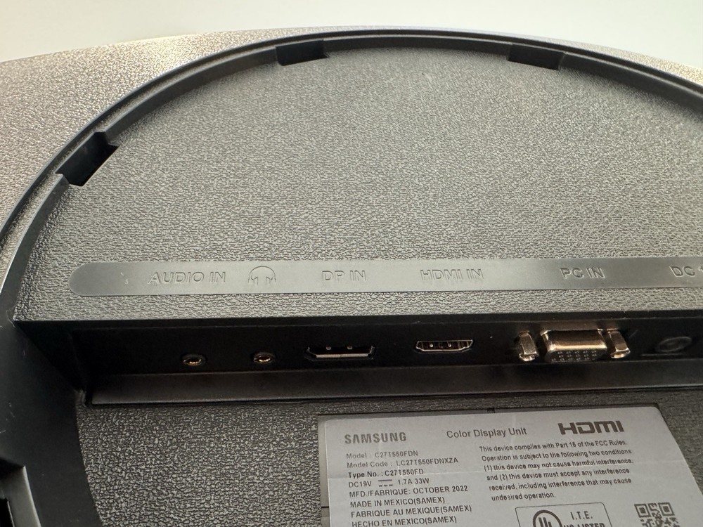 Compact Standard Description This Samsung C27F398 27 inch curved monitor is in great working condition. It features a Full HD 1080p display with vibrant colors and smooth visuals. It includes HDMI and DisplayPort inputs which makes it easy to connect to PCs, laptops, gaming consoles, and more. The screen has a clean picture with no dead pixels