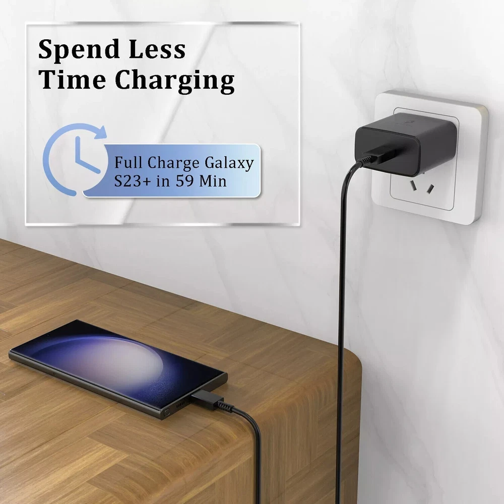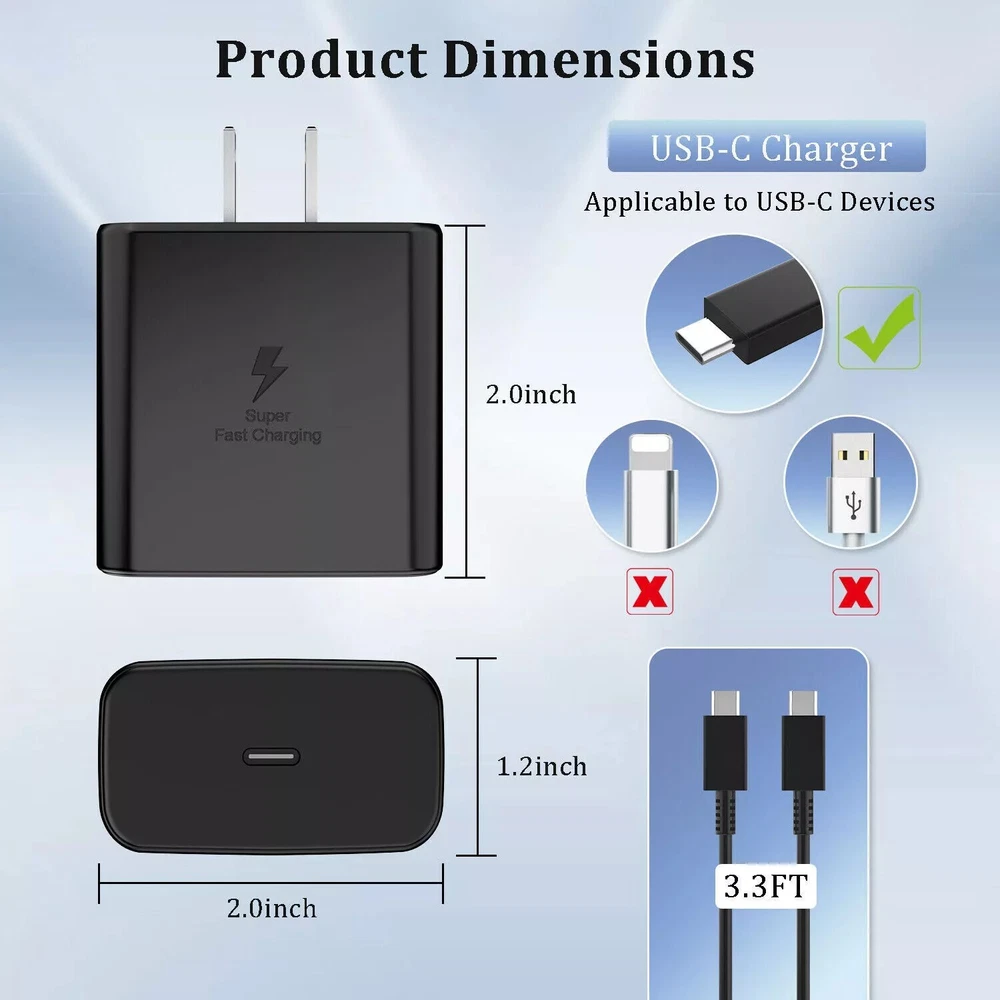 Features 【45W Fast Charging】 PD3.0 power supply technology ensures that all Samsung Galaxy devices can get the best and fast safe charging experience (45W) 【Type C PD Charger】 USB C Charger can charge most USB Type-C and PD devices and non-PD devices at full speed. 【USB-C to USB-C Charging Cable】 6 feet , convenient for charging in different occasions, suitable for travel, home, car, office, etc.6FT Type C to C Cable - USB-C connector offers a user-friendly reversible design, fast Charging and transferring, Up to 480 Mbps data transfer speed. Power output up to 3 Amp 【Fast Charging】 Built-in smart chip, PD wall charger automatically matches the current required by the device. 【Safe and Reliable】 Overcurrent, overvoltage and short circuit protection can effectively protect your equipment from damage. 【Small Size】 Small size and lightweight weight ensure maximum portability. Slim enough to carry with you. 【Wide Compatibility】 USB-C PD3.0 charger is consistent for Samsung, etc. Specifications Color:Black Material: ABS Type: 45W Super Fast Charger Type C (USB C) Input: 100-240V, 50-60Hz, 1.2A Output: (PDO): 5.0V-3.0A or 9V-3.0A or 15.0V-3.0A or 20.0V-2.25A (PPS) 3.3-11.0V--4.05A or 3.3-16.0V--2.8A or 3.3-21.0V--2.1A Consistent with For Samsung Galaxy A20/A21/A22/A50/A51/A52/A70/A71/A72/A90/A91/A92 For Samsung Galaxy S8/S8+ For Samsung Galaxy S9/S9+ For Samsung Galaxy S10/S10+/S10e For Samsung Galaxy S20 For Samsung Galaxy S20 5G For Samsung Galaxy S20+ For Samsung Galaxy S20+ 5G For Samsung Galaxy S20 Ultra 5G For Samsung Galaxy S20 FE For Samsung Galaxy S21 5G For Samsung Galaxy S21+ 5G For Samsung Galaxy S21 Ultra 5G For Samsung Galaxy S22 For Samsung Galaxy S22 Plus For Samsung Galaxy Note10, For Samsung Galaxy Note10+, For Samsung Galaxy Note10+ 5G, For Samsung Galaxy Note10 5G, For Samsung Galaxy Note8, For Samsung Galaxy Note9 All Type C Device Package Include: 1 x 45W Super Fast Wall Charger + 6FT Cable