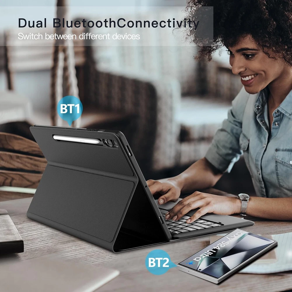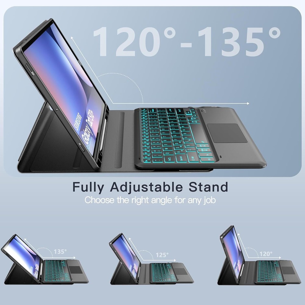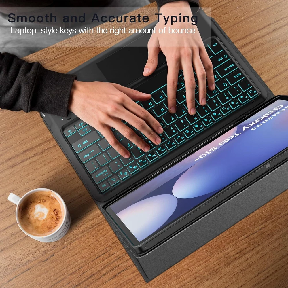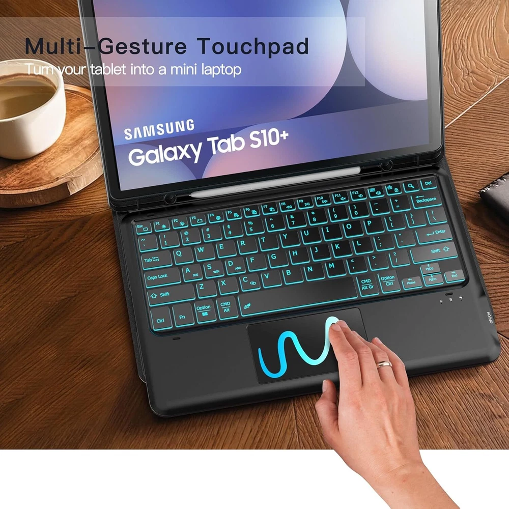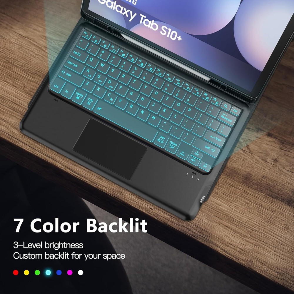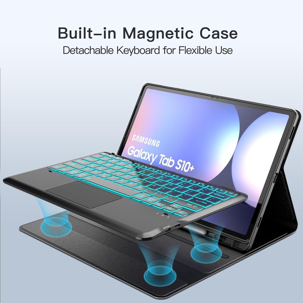 inkolelo Samsung Galaxy Tab S10+Plus S9 FE+ / S9+ Case with Keyboard 12.4 inch,Detachable Smart Tablet Keyboard with 7 Colors Backlit & Touchpad & S Pen Holder,Tab S9 FE Plus/S9 Plus Keyboard Case Product Details Package Dimensions: 12 x 8 x 1.38 inches Item Weight: 2 pounds Manufacturer: inkolelo Country of Origin: China Item model number: DYK-S9FE+ Batteries: 1 Lithium Polymer batteries required. (included) Brand: inkolelo Compatible Devices: Samsung Galaxy Tab S9 FE+ 5G (SM-X610/X616B)/ S9+ Plus 2023 12.4 inch(SM-X810/X816B/X818U) Connectivity Technology: Bluetooth Keyboard Description: Multi Functional Special Feature: Detachable, Portable, Touchpad, Backlit Number of Keys: 78 & : Featuring 3 brightness levels and 7 backlight colors, easily adjustable via shortcut keys. Perfect for typing in low-light settings, helping to reduce eye strain whether you're working or gaming in the dark. The wireless keyboard lasts up to 80 hours on a single charge without backlighting, or 7 hours with backlighting. Fully recharges in just 2-3 hours using the included Type-C charging cable. : The samsung tablet keyboard is lightweight and magnetically detachable. It connects via Bluetooth with a range of up to 10 meters. The Galaxy Tab S9+ case offers three viewing angles to accommodate your typing and viewing preferences, helping prevent joint discomfort and freeing up your hands for other activities. : The touchpad supports multi-finger gestures, such as tapping, swiping, scrolling, and pinch-to-zoom. Effortlessly navigate your tablet with precise fingertip control, mimicking the feel of a laptop mouse for a more comfortable and efficient experience. : The foldable design provides front and back protection on the go. An integrated S Pen slot keeps your pen secure, while the precise cutouts ensure easy access to all ports, sensors, speakers, microphones, and cameras.
