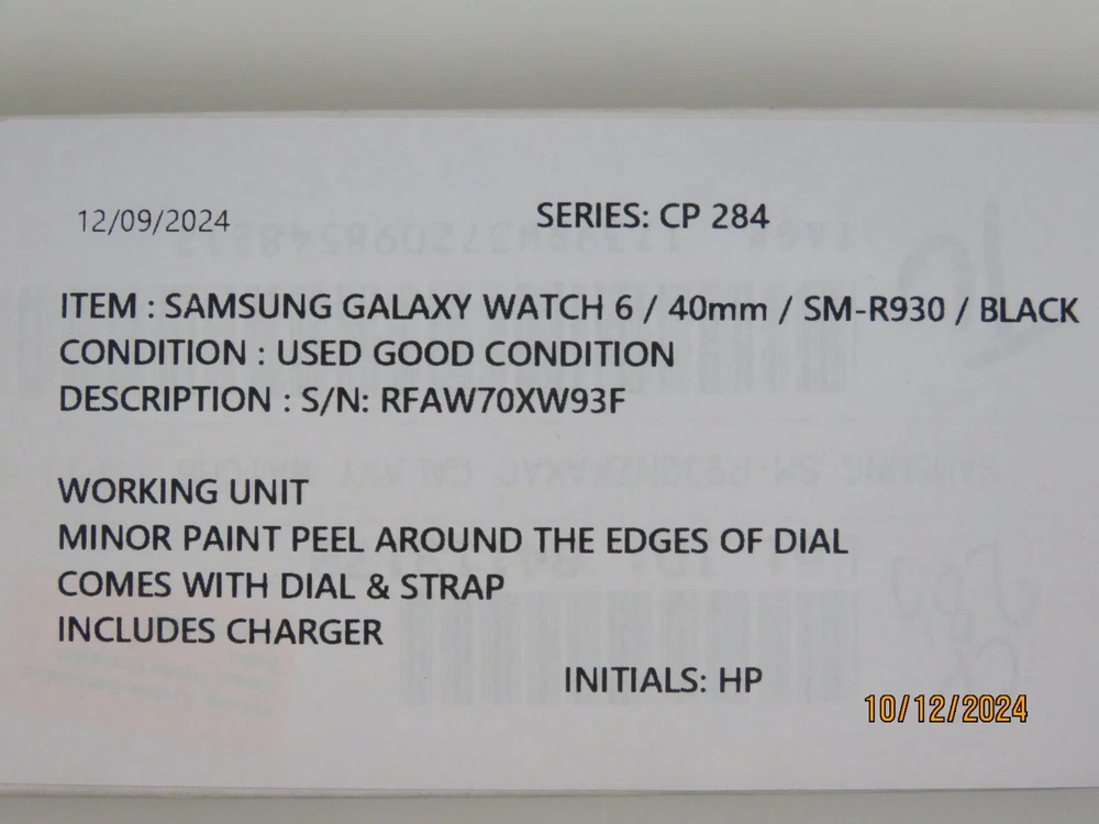 Samsung Galaxy Watch6 40mm Graphite Bluetooth Smartwatch SM-R930NZKAXAA Functional Condition: Tested and Functional. Minor Paint Peel Around The Edges Of The Dial. Cosmetic Condition: This is a Used Item and Normal Wear (Scuffs & Scratches) is Expected. Items included in this listing: Watch Strap Charger Items NOT included in this listing: N/A Thank you for Shopping with Us! ENJOY Free Shipping in USA & Low Cost Shipping to CANADA! Terms of Sale NOTE: Our Listings only include items as pictured - Please do not assume any item is included if its not pictured. We will try our best to picture all items included in this listing as well as its cosmetic condition. We Guarantee & Stand Behind our product and commitment to provide you with o nly Original, Branded, OEM & Genuine Products Shipping A complete and correct shipping address is essential. We cannot guarantee the shipping address can be changed after checkout. Sales Tax will be charged to all Canadian & USA Buyers. Combined shipping is not guaranteed. We are unable to change any content of your order based on the eBay checkout note or PayPal message. Customers with shipping addresses outside of the U.S.A and Canada are responsible for all duties and import taxes. Please contact your customs for information Bidding All items are accurately described and pictured. Please ensure you are consciously bidding on the items as described. Payment Payments are expected at the time of purchase or in case of Auctions, at the end of auctions. Payments are managed via eBay Managed Payments Contact Us Your positive feedbacks are extremely valuable to us. If you have any concerns about your order, please contact us through eBay message to resolve any issues before leaving a negative feedback or opening a dispute. We will reply within 24 Hours Return Policy All items are in used condition unless specified.