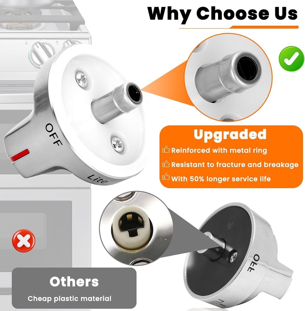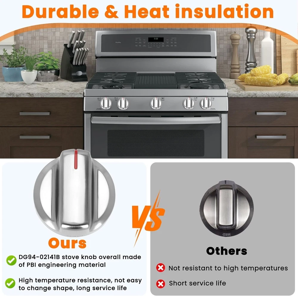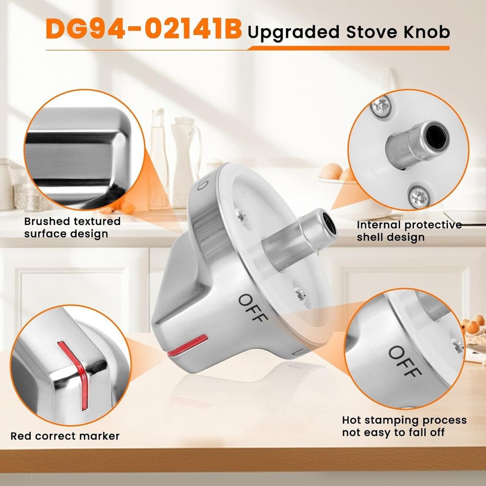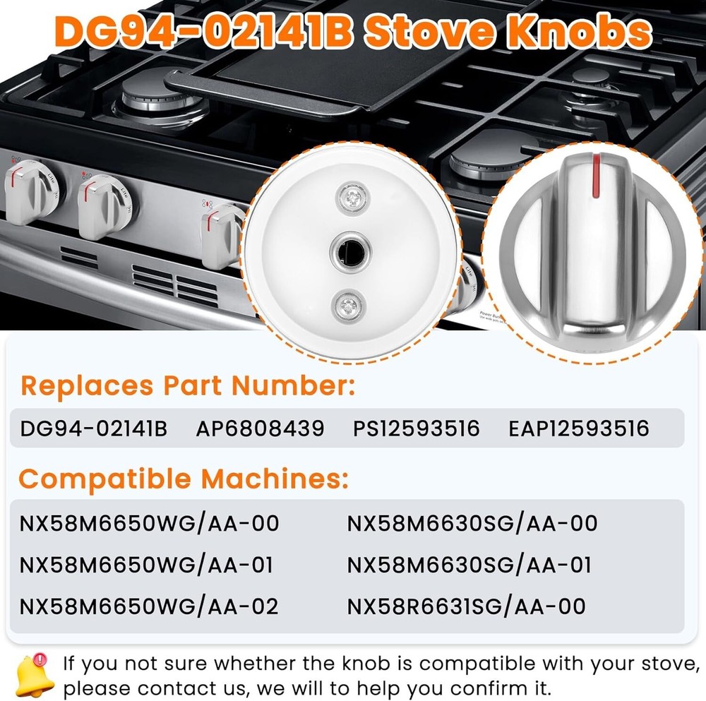 About this item 【Good Oven Knobs Replacements】Possible solution: ① Stove won't start ② Knob is damaged ③ Knob doesn't work/not select setting. Replacement part number: DG94-02141B, AP6808439, PS12593516, EAP12593516. 【Compatible With Samsung Range Oven】NX58M6650WG/AA-00, NX58M6650WG/AA-01, NX58M6650WG/AA-02, NX58M6630SG/AA-00, NX58M6630SG/AA-01, NX58R6631SG/AA-00. If you don't know your stove knob model. 【Product Upgrade】DG94-02141B knob is made of PBI engineering plastic as a whole, which is more heat-resistant, wear-resistant, won't burn your hands and other features, the inside is made of metal stainless steel, overall reinforcement, not easy to deform. The upgraded gas range knobs holes are reinforced by an extra metal ring, which ensures that the knobs will withstand heavy loads and not break easily. 【Easy Installation】 No tool required, easily install the knobs by yourself and quickly get your range oven burner back to work within few minutes. These replacement knobs look and function just like the originals and offer a cost-effective alternative to OEM quality at half the price