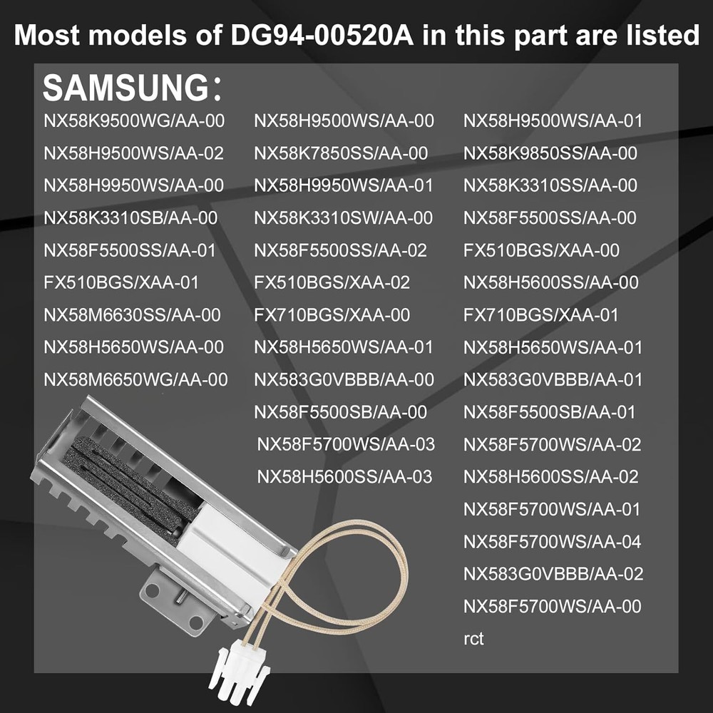 Product Description High Quality The DG94-00520A igniter is crafted from high-quality materials and put through multiple testing processes, meeting the same standards as OEM products. This Samsung oven igniter, DG94-00520A, can extend the lifespan of your stove or oven. By using it, you can save time, energy, and avoid the service costs of hiring repairmen. Efficient Problem - Solving The DG94-00520A oven igniter is highly effective in resolving issues such as abnormal oven heating, irregular oven operation, a defective igniter, and the oven failing to light up. Affordable Price with Exceptional Value Autoparts-plus Best choice of motor parts DG94-00520A New Gas Range Oven Flat Igniter for Samsung Gas Stove NX58F5500SS Product Description High Quality The DG94-00520A igniter is crafted from high-quality materials and put through multiple testing processes, meeting the same standards as OEM products. This Samsung oven igniter, DG94-00520A, can extend the lifespan of your stove or oven. By using it, you can save time, energy, and avoid the service costs of hiring repairmen. Efficient Problem - Solving The DG94-00520A oven igniter is highly effective in resolving issues such as abnormal oven heating, irregular oven operation, a defective igniter, and the oven failing to light up. Affordable Price with Exceptional Value As a cost-effective alternative, the DG94-00520A igniter helps you cut down on expensive repair bills while maintaining the performance of your range. You can refresh your kitchen without overspending and no longer worry about ignition problems delaying your cooking. Superior Ignition Performance The upgraded gas stove oven igniter, DG94-00520A, is made of high-quality materials. Its lighter temperature can rapidly reach 2000-2800°F within 1 minute. A high-temperature stainless-steel shield safeguards the igniter. In case the wire connectors don't match, you need to cut the connectors and splice the wires with porcelain wire nuts. Bid farewell to frustrating ignition failures and enjoy easy meal preparation every time. Perfect Replacement Our DG94-00520A can flawlessly replace 2692271, AP5577941, EAP4241428, PS4241428 Suitable Samsung popular models include: Press Ctrl+F and enter model for quick search. NX58H5600SS/AA NX58K3310SS FX710BGS/XAA NX58N9420SG/AA-00 NX58R6631ST/AA-00 NX58M6650WS/AA-00 NX58F5500SW/AA-02 NX58M6850SG/AA02 NX58R4311SG/AA01 NX58H9950WS/AA-00 NX58H9950WS/AA-01 NX58K3310SS/AA-00 NX58M6650WG/AA-00 NX58K3310SB/AA-00 NX58K3310SW/AA-00 NX583G0VBBB/AA-00 NX583G0VBBB/AA-01 NX583G0VBBB/AA-02 NX58F5500SB/AA-00 NX58F5500SB/AA-01 NX58F5500SW/AA-00 NX58F5500SW/AA-01 NX58F5700WS/AA-00 NX58F5700WS/AA-01 NX58F5700WS/AA-02 NX58F5700WS/AA-03 NX58F5700WS/AA-04 NX583G0VBSR/AA-01 NX583G0VBWW/AA-00 NX583G0VBWW/AA-01 NX583G0VBWW/AA-02 NX58F5300SS/AA-00 NX58F5300SS/AA-01 NX58J5600SG/AA-00 NX58J7750SG/AA-00 NX58J7750SS/AA-00 NX58J7750SS/AA-01 NX58K7850SG/AA-00 NX58K9850SG/AA-00 NX58K9850SG/AA-02 NX58K9852SG/AA-00 NX58M5600SB/AA-00 NX58M5600SW/AA-00 NX58M6850SG/AA-00 NX58M6850SS/AA-00 NX58M9420SS/AA-00 NX58M9420SS/AA-01 FX710BGS/XAA NX58M6650WG/AA-01 NX58M6650WG/AA-02 NX58H9500WS/AA-03 NX58H9500WS/AC-01 NX58H9500WS/AC-02 NX58H9500WS/AC-03 NX58K7850SS/AA-01 NX58K7850SS/AA-02 NX58K9850SS/AA-01 NX58K9850SS/AA-02 NX58K9850SS/AA-03 NX58K9850SS/AA-04 NX58M6630SS/AA NX58M6850SS/AA-01 NX58H5600SS/AA-02 NX58H5600SS/AA-03 NX58K3310SB/AA NX58K3310SS/AA NX58J5600SG/AA-01 NX58J5600SG/AA-02 NX583G0VBBBAA NX58K9500WG/AA-01 NX58K9500WG/AA-02 NX58K7850SG/AA-01 NX58K7850SG/AA-02 NX58K9850SG/AA-01 NX58K9850SG/AA-03 NX58M6850SG/AA-01 NX58M9960PM/AA NX58M5600SW/AA-01 NX58K3310SW/AA NX58M6630SS/AA-01 NX58M5600SB/AA-01 NX58M6630SG/AA-00 NX58M6630SG/AA-01 NX58J7750SG/AA NX58M9960PS/AA NX58R5601SG/AA-00 NX58R5601SS/AA-00 NX58R4311SS/AA-00 NX58T7511SS/AA-00 NX58R4311SG/AA-00 NX58R6631SS/AA-00 NX58R6631SG/AA-00 NX58R9421SG/AA-00 NX58F5500SS/AA-00 NX58F5500SS/AA-01 NX58F5500SS/AA-02 FX510BGS/XAA-00 FX510BGS/XAA-01 FX510BGS/XAA-02 NX58H5600SS/AA-00 NX58H5600SS/AA-01 NX58K9500WG/AA-00 NX58M6630SS/AA-00 NX58H9500WS/AA-00 NX58H9500WS/AA-01 NX58H9500WS/AA-02 NX58K7850SS/AA-00 FX710BGS/XAA-00 FX710BGS/XAA-01 FX710BGS/XAA-02 FX710BGS/XAA-03 NX58K9850SS/AA-00 NX58H5650WS/AA-00 NX58H5650WS/AA-01 NX58H5650WS/AA-02 If you're unsure whether our DG94-00520A igniter is compatible with your oven, please contact us. The DG94-00520A igniter is specifically designed for Samsung ranges, ensuring seamless integration with your appliance. Compatible with multiple models, it's the ideal solution for quickly restoring your range's performance. Item Specifics Power CarBole Model Number WB13K21 Manufacturer Surface Ignitor Corp Product Type Oven Ignitor Number of Items in Set According to the option you choose Power Source Natural Gas MPN WB13K21 Suitable For Conventional Oven/Stove Item Included 1/2/5 pcs Color Multicolor Brand GE Installation Freestanding Compatible Model RGB532BEA2WH & many others. Material Ceramic Type Igniter Model WB13K21 DS020KX Compatible Brand For General Electric, Kenmore, Hotpoint, Surface Ignitor Manufacturer Warranty Lifetime Payment Payment:PayPal,Credit card, Apple Pay, Google Pay Additional shipping fee may be charged for buyers from Puerto Rico, Hawaii, Alaska, Guam , and the U.S. military address of the United States or other remote area (zone 8-10). Shipping * All of the items will be shipped to buyer's EBAY address, please confirm your address on Ebay before you buy. * Import duties and any other fee are not included in the item costs or shipping costs. Buyers are responsible for those charges. Returns If the item is broken or has any other problem when you receive it, please feel free to contact us. We will handle your problem as soon as possible. You can return the item for a replacement or refund. You have 30 days to return the item since the day that the item was delivered. Contact Us Please feel free to contact us if you have any question,we will try our best help you solve the problem,t
