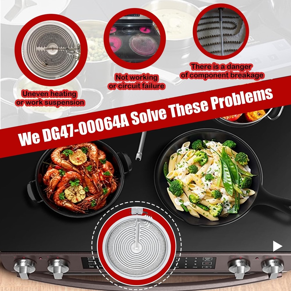 UPGRADE DG47-00064A DG47-00056A Compatible With Samsung Stove Range Electric Range 9/12 Inch Dual Radiant Heater Element Replacement EAP11729066 AP5986691 PS11729066 Surface Element Product Details Style: DG47-00064A Brand: OEM home MPN: DG47-00064A UPC: Does not apply EAN: Does not apply Manufacturer: OEM home Part Number: DG47-00064A Item Weight: 2.68 pounds Product Dimensions: 12 x 12 x 1.3 inches Country of Origin: China Item model number: DG47-00064A , DG47-00056A Style: DG47-00064A Included Components: Radiant Heater Element Batteries Included?: No Batteries Required?: No Warranty Description: 1 year Date First Available: October 7, 2023 [Excellent Quality] DG47-00064A Haliant/Radiant surface component temperature sensor has been upgraded to a new composite metal material,with a longer service life. [High Adaptability] Upgrade DG47-00064A radiant surface element,use for Samsung Stove,replacing: DG47-00056A EAP11729066 AP5986691 PS11729066.Circuit connector improved , easy to connect operation. [Stronger Heating] Upgrade DG47-00064A haliant surface element dual radiation range, and the heating increased , resulting in higher efficiency and faster heating. [Note] Before installing, take a photo of the original element's interface wiring pattern. Install the wires to the new component terminals according to the connector markings in the photo. If the component doesn't work post-installation, double-check the interface connection.