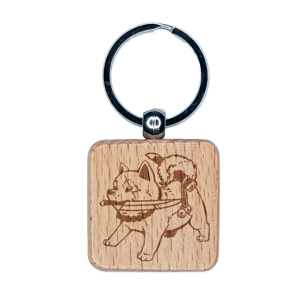 Samurai Dog Shiba Inu with Knife Engraved Wood Square Keychain Tag Charm
