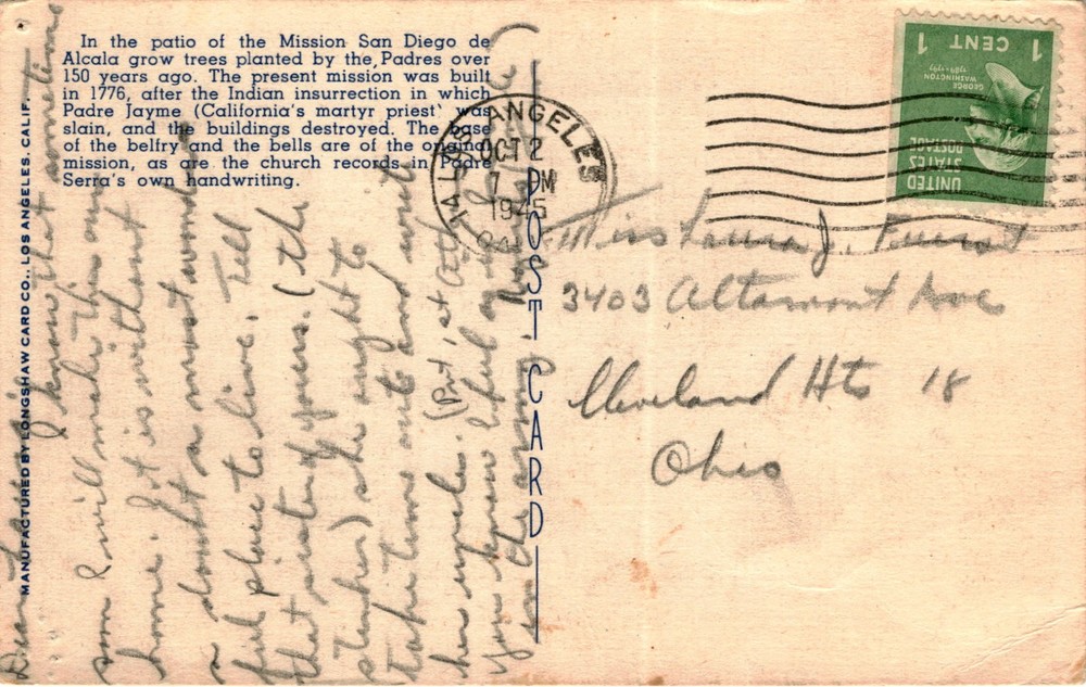 MAKE AN OFFER. THE MORE YOU BUY THE BETTER DEAL I WILL ACCEPT The postcard features an image of the first mission in San Diego, known as Mission San Diego de Alcala, which was founded in California in 1769. The mission's present buildings were constructed in 1776 after an Indian insurrection that resulted in the destruction of the previous structures and the death of Padre Jayme, a prominent priest in California.