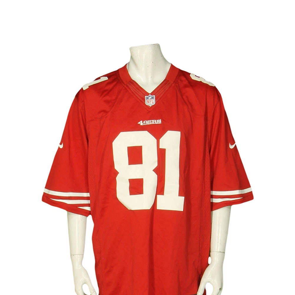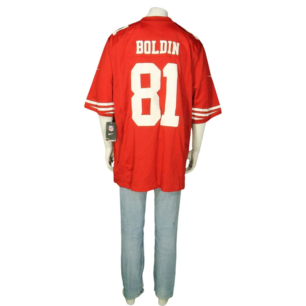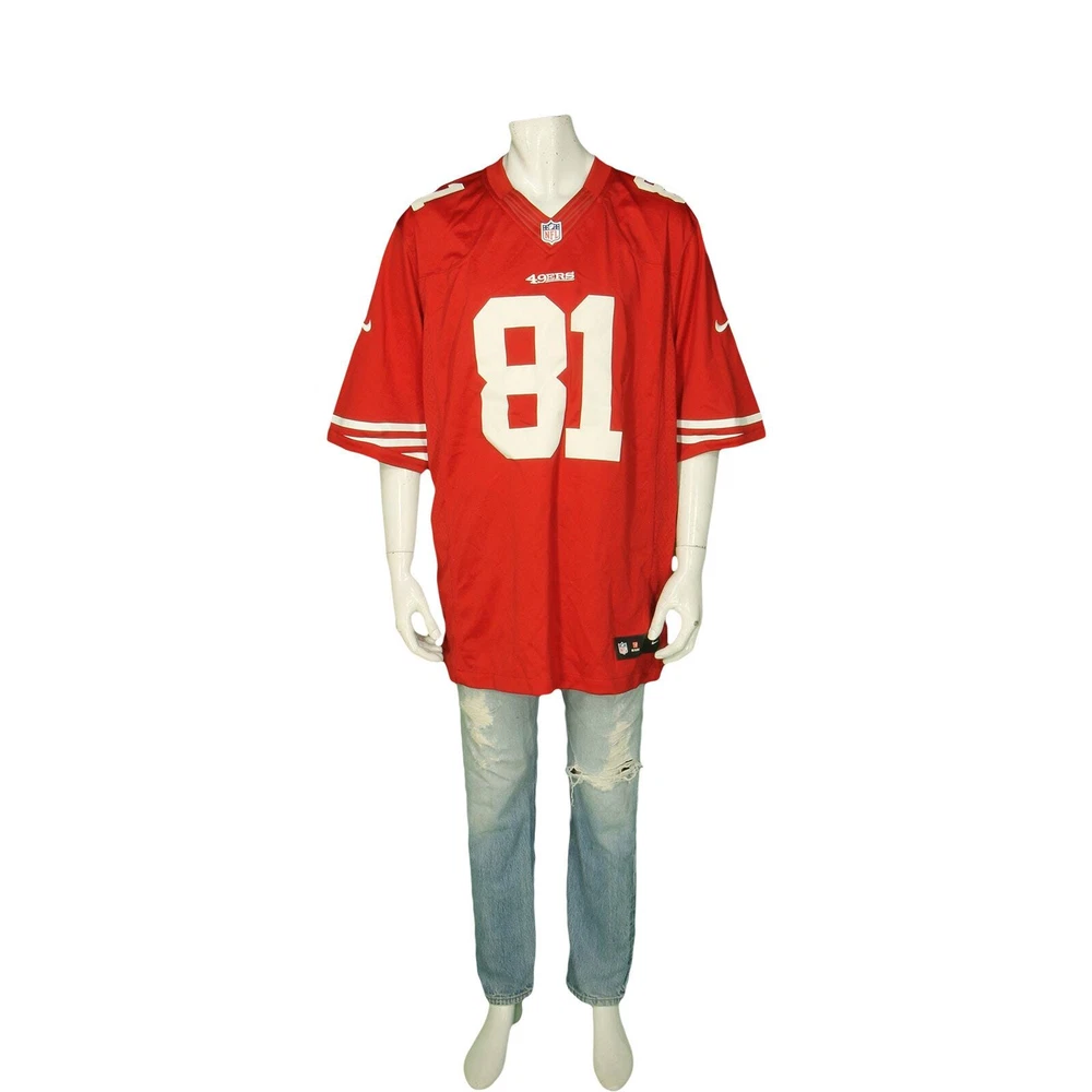 San Francisco SF 49ers Anquan Boldin Nike On Field Sport NFL Football Authentic Stitched Sewn Polyester Red Jersey 2XL material: 100% recycled polyester letters and numbers are sewn made in Honduras of USA fabric color: red, white condition: the white numbers have some minor staining. Nothing major otherwise new condition new with tags size on tag: 2XL mannequin is 6' 2" and a size medium length (from the front on either side of the collar down to the bottom edge): 33 armpit to armpit: 27.5 all measurements are in inches and taken with the garment laying flat any major defect will be mentioned and/or photographed 15204 g6h2 n8f6a