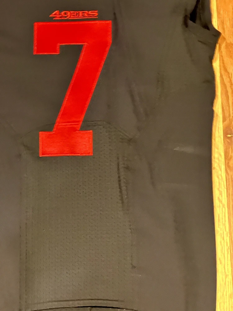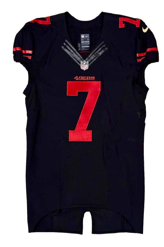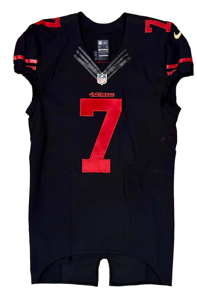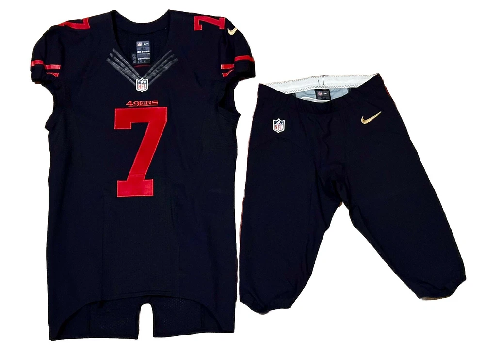 This San Francisco 49ers black game jersey is a must-have for any Colin Kaepernick fan. The jersey, made in 2015, is an original and features the player's name and number on the back. It is a single, size 44 jersey and size 34 pants that were used in a game. The jersey is perfect for any football enthusiast or collector of sports memorabilia. It is an authentic piece of game-worn clothing that represents the National Football League (NFL) and the San Francisco 49ers. This item is a unique addition to any collection and is sure to impress any fan of Colin Kaepernick or the NFL.