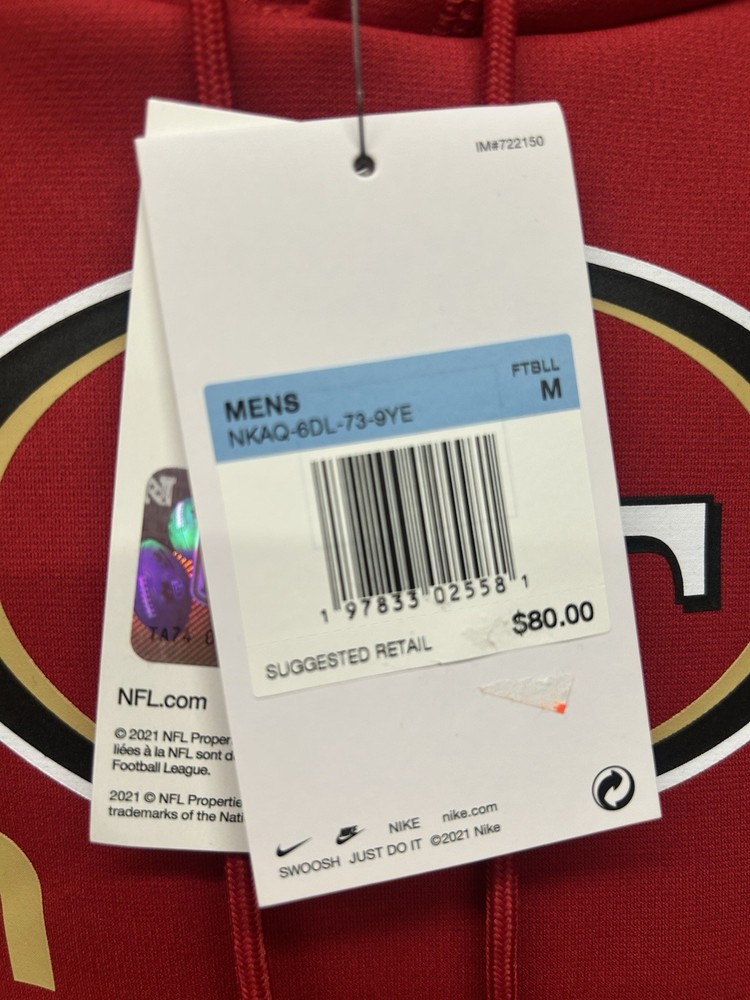 Product:SweatshirtOfficially Licensed:YesEvent/Tournament:NFLSize:MColor:RedGender:MenCountry of Origin:ChinaTeam:San Francisco 49ersPre & Post Season:Regular SeasonBrand:NikeLeague:National Football League (NFL)Sport:Football