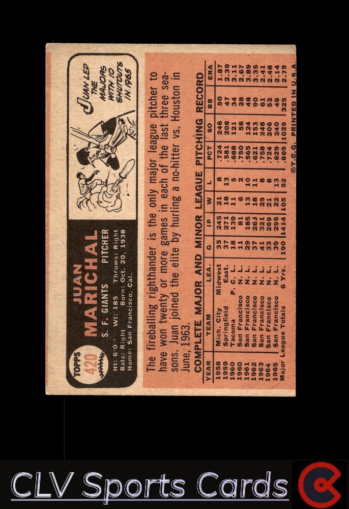 This is a nice example of a 1966 Topps #420 Juan Marichal Other important information about this card: In 1966 Juan Marichal played for the San Francisco Giants. Please check out our other listings for more great cards.