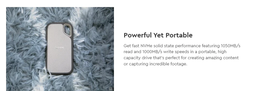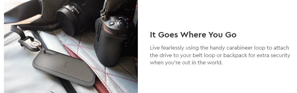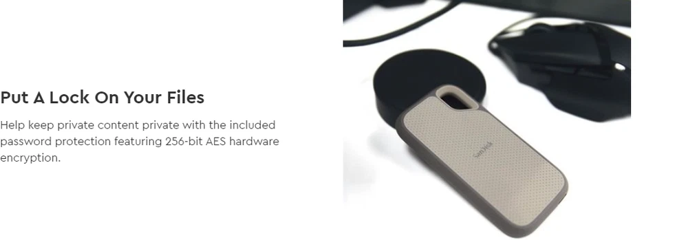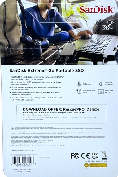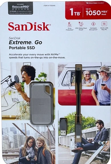 SanDisk 1TB Extreme Go SSD: Read Speed of 1050MB/s on the SanDisk 1TB Extreme Go SSD Portable Solid State Drive connected via USB-C. Use the inbuilt password protection, which has 256-bit AES hardware encryption, to assist in maintaining the confidentiality of sensitive material. SanDisk Extreme Go SSD 1 terabyte With this compact, high-capacity drive, you can get fast NVMe solid state performance, with read rates of 1050 MB/s and write speeds of 1000 MB/s. This drive is ideal for generating spectacular material or taking incredible film. This hard drive is so tough that it can withstand drops of up to two meters and has an IP55 rating, which protects it from dust and water. ***Order by 4pm for same-day shipping. Free shipping on all orders!***