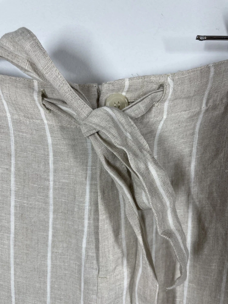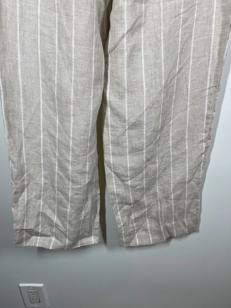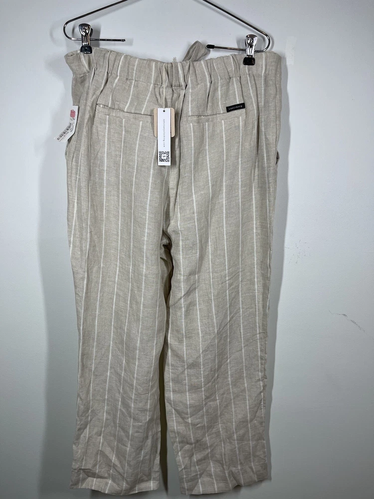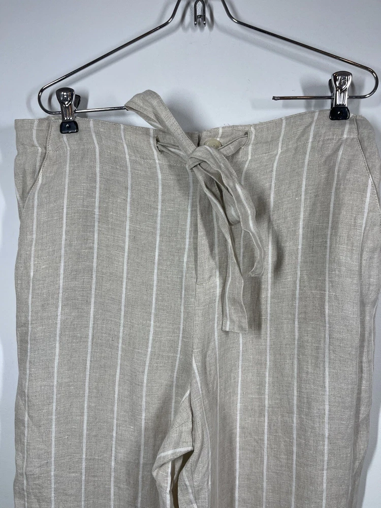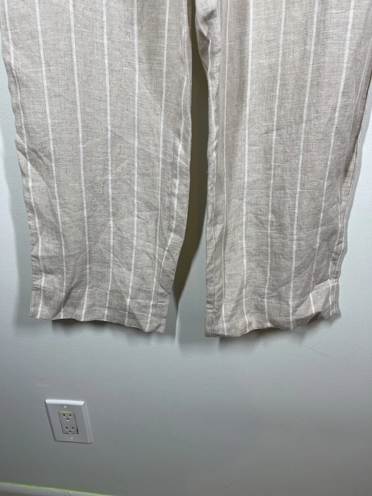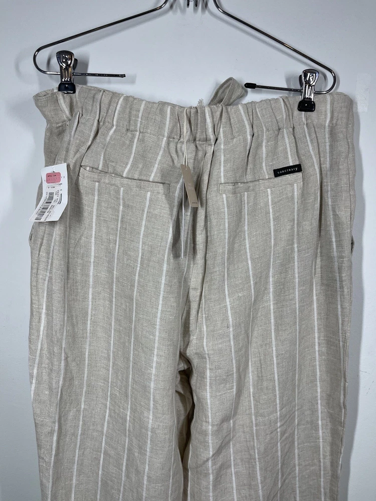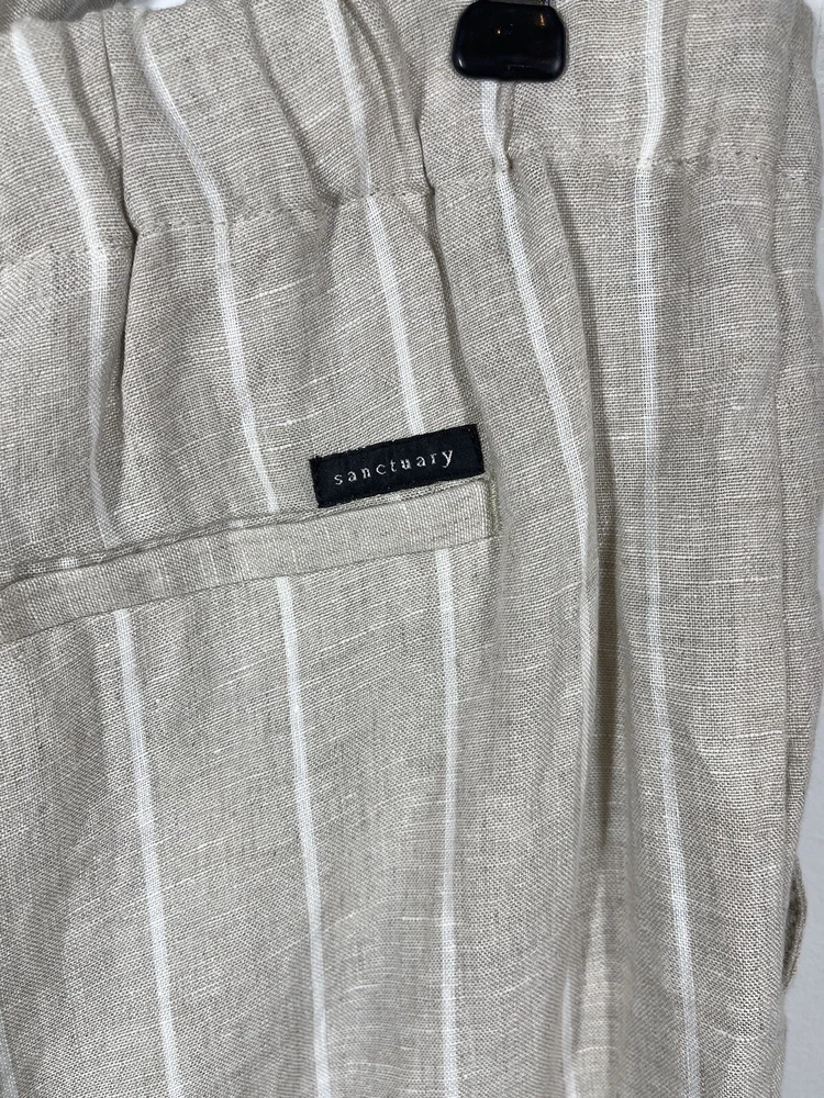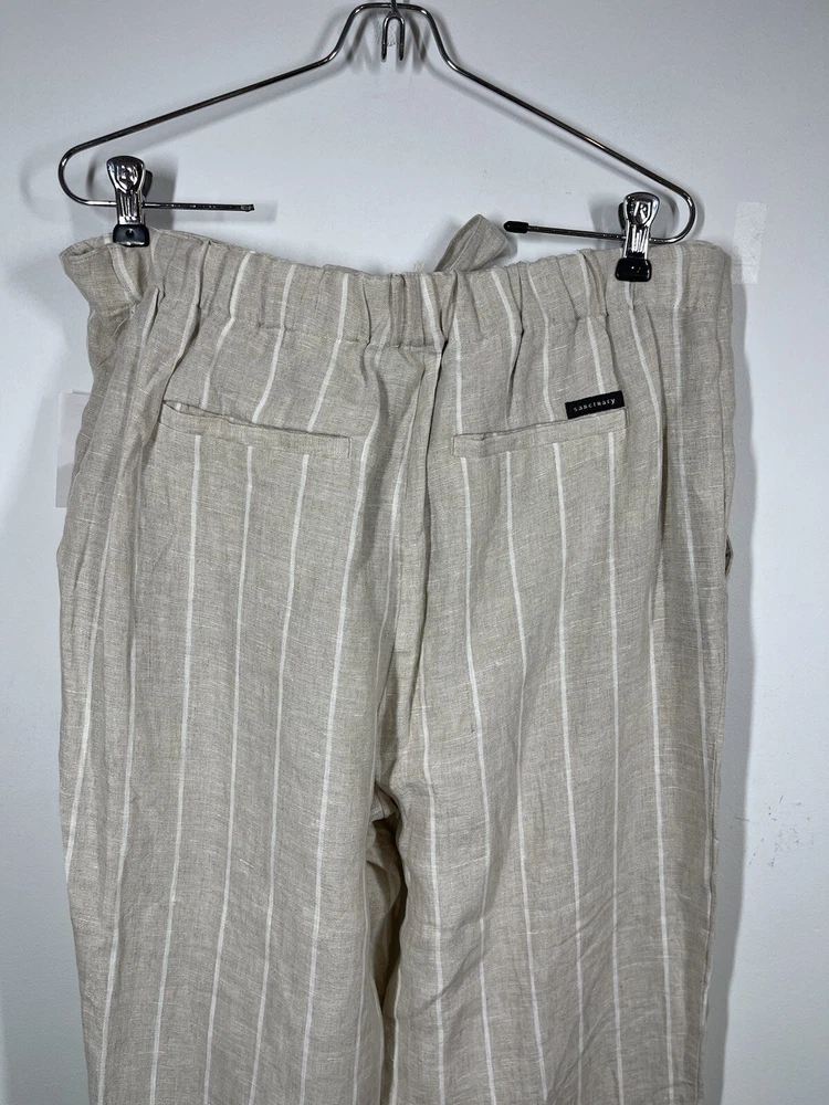 Sanctuary Women’s 100% Tan Linen White Striped Pants Tie Waist Pockets Size 29
