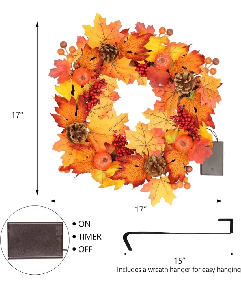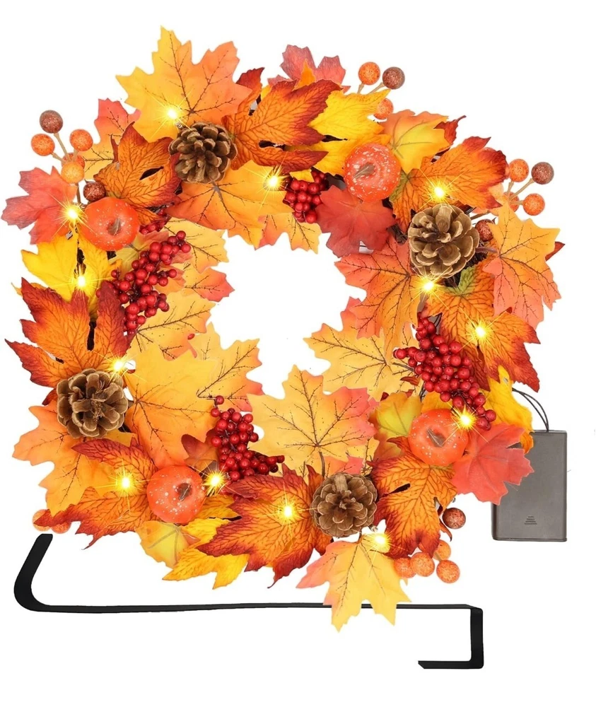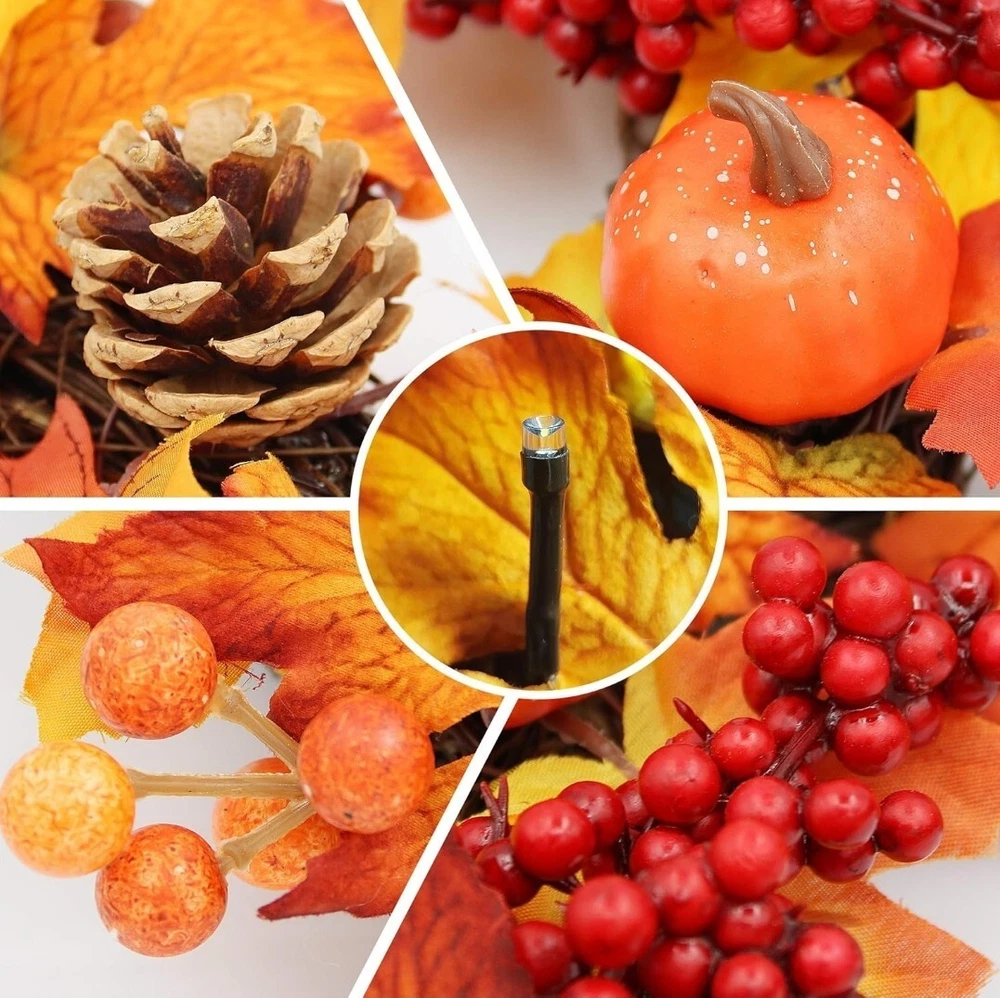 Durable Material: This fall wreath is made of high quality materials, it is created with an eye catching combination of fall elements, such as fiery colored maple leaves, red berries, pumpkins, pinecones, never wither and always keep vivid natural form, make this fall wreath in perfect interpretation of autumn's bounty. 🍁 Light Up Fall Season: This glowing fall door wreath is decorated with 20 LED lights, provide the perfect finishing touch to this timeless autumn wreath, the warm lighting creates a unique atmosphere, makes a perfect Thanksgiving outdoor decoration to light up a romatic scene for harvest festival for the whole season! 🍁 Beautiful Gift Box Packed: The fall wreath for front door comes with a beautiful box, it can be used year after year to store your wreath when the season is over. And it is also can be a great thanksgiving gift for your family, friends or coworkers. 🍁 Built-in Hanging Loop: This outdoor fall wreath is suitable for both indoor and outdoor use, you can hang it above your fireplace or on a living room wall. Included a hanging hook, makes it easy to hang on your front door, no more dealing with wreaths falling off your door! 🍁 Great Thanksgiving Front Door Decorations: The size of this wreath in the box is about 12 inch, you can extended outer diameter can reach 17 inches, this thanksgiving door wreath will transform your bland front door into a vibrant, attractive entryway that welcomes your closest family and friends into your home, brighten your fall front door decoration.