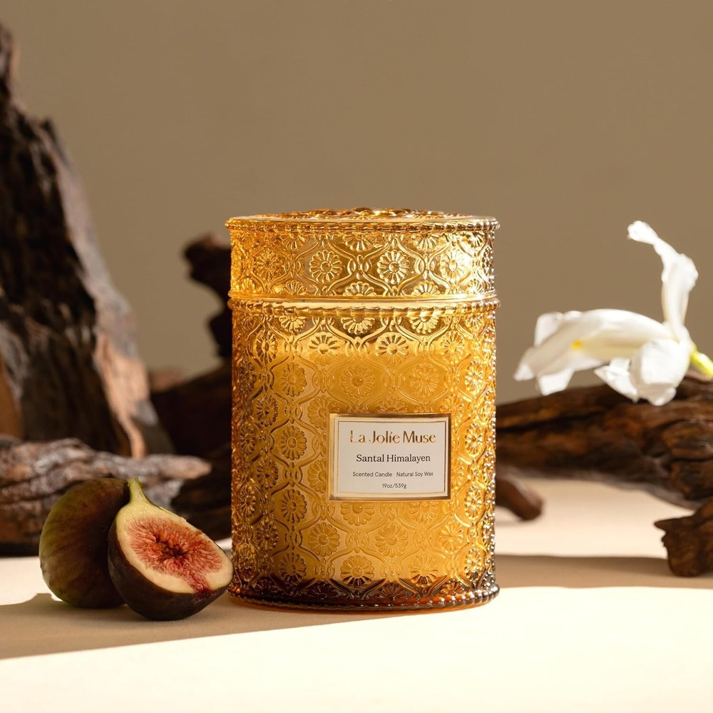 LA JOLIE MUSE Sandalwood Candle, Wood Wicked Large Candle for Home Scented, Scented Candle Gifts for Men&Women, Long Burning Glass Jar Candle, Santal Himalayen, 19oz SANTAL HIMALAYEN - A harmonious blend of fresh apple, green fig, creamy jasmine, and velvety orris, resting on airy sandalwood, amber, and musk. A refined interpretation of sandalwood, perfect for those who prefer subtlety over intense fragrance. WOOD WICK DESIGN - Designed with a natural, non-toxic wood wick, this wooden wick candle gives off a soft, nostalgic, crackling sound with minimal soot when burning. A WELL-LOVED LUXURY - Part of our most beloved home fragrance series with lots of love from repeat customers, there are various unique colors and scents to choose from. Find your signature scent now. DECORATIVE JAR CANDLE - Embossed delicate daisy patterns adorn a thick, luxury glass jar. The jar itself is a statement home décor piece. A perfect gift idea that soothes and beautifies any space. LARGE CANDLE - 19 oz/ 539 g This large natural soy wax candle offers in-depth relaxation for approximately 90 hours and is vegan, cruelty and paraben-free and biodegradable.