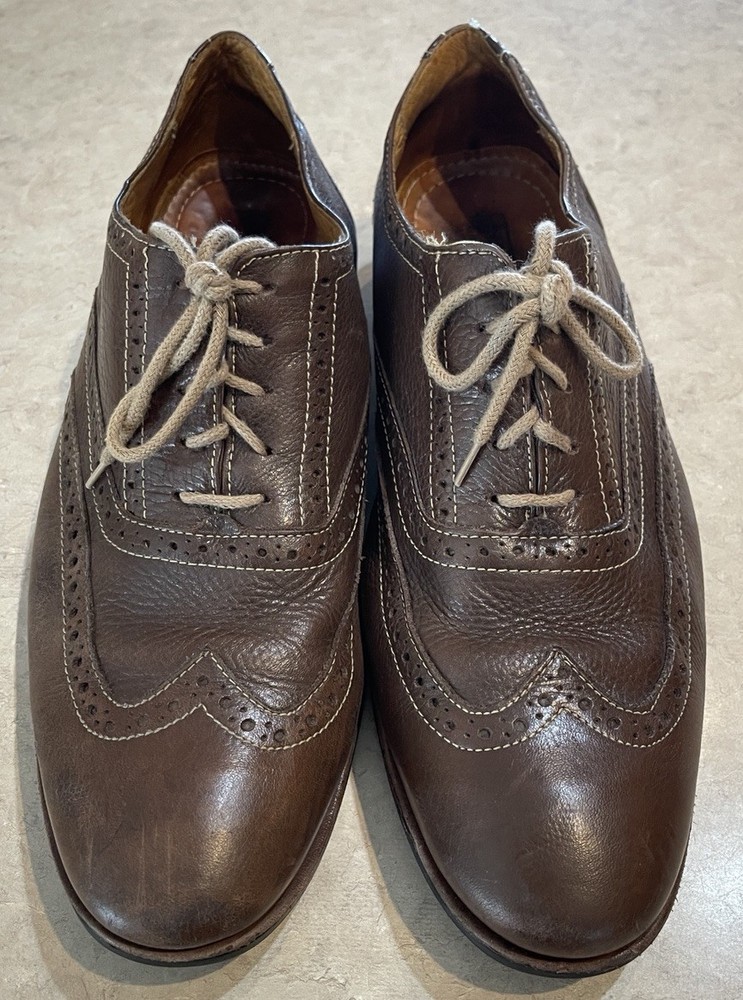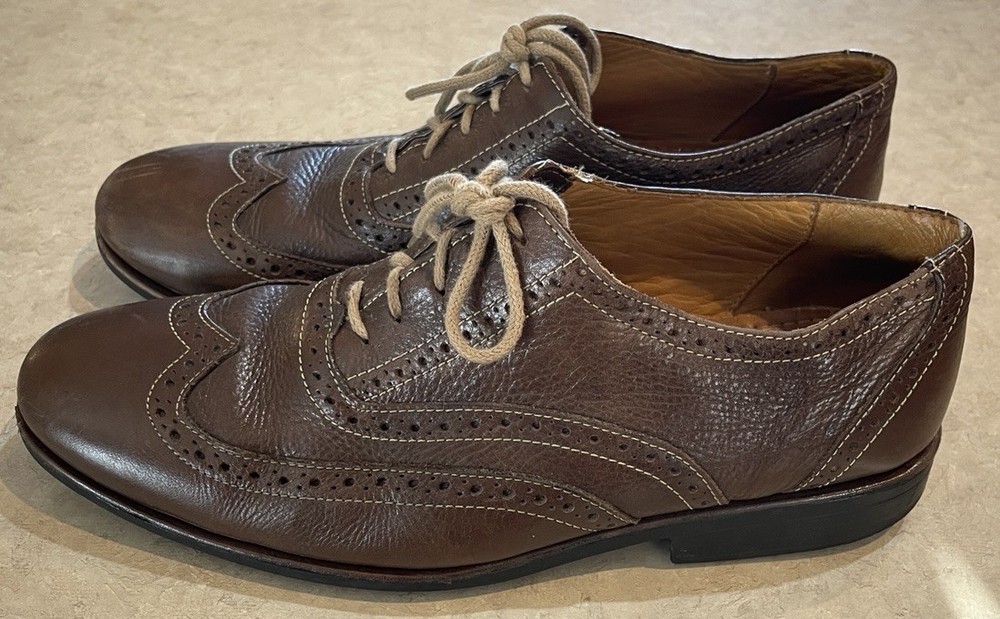 These Sandro Brown Leather Wingtip Shoes are a stylish choice for men looking for high-quality, Brazilian-made footwear. The classic wingtip design, round toe shape, and lace-up closure give these shoes a sophisticated and refined look. Crafted with leather upper material and a comfortable gel insole, these shoes are perfect for formal events or a sharp dress-up occasion. The brown color and solid pattern add to the timeless appeal of these Oxford-style shoes, making them a versatile and elegant addition to any man's wardrobe. These shoes are in good preowned condition with light signs of wear. Please see ALL photos for a better idea on condition, and any details to the shoes.