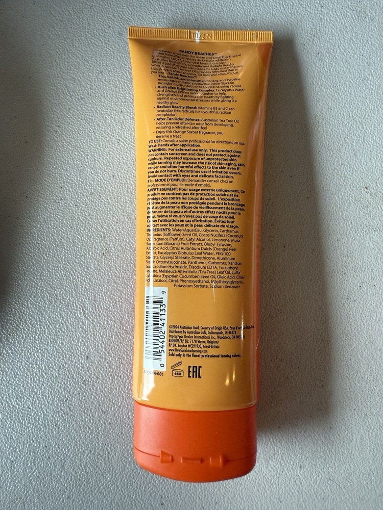 Australian Gold Sandy Beaches tanning lotion is specifically designed for sunbed use, providing a full-body coverage with a 8.5 oz volume. With a lightweight white formula, this product is perfect for achieving a golden tan while protecting your skin with its SPF 0 Sun Protection Factor. Made in the United States, this lotion is ideal for those looking to enhance their tanning experience with a nourishing and high-quality product.