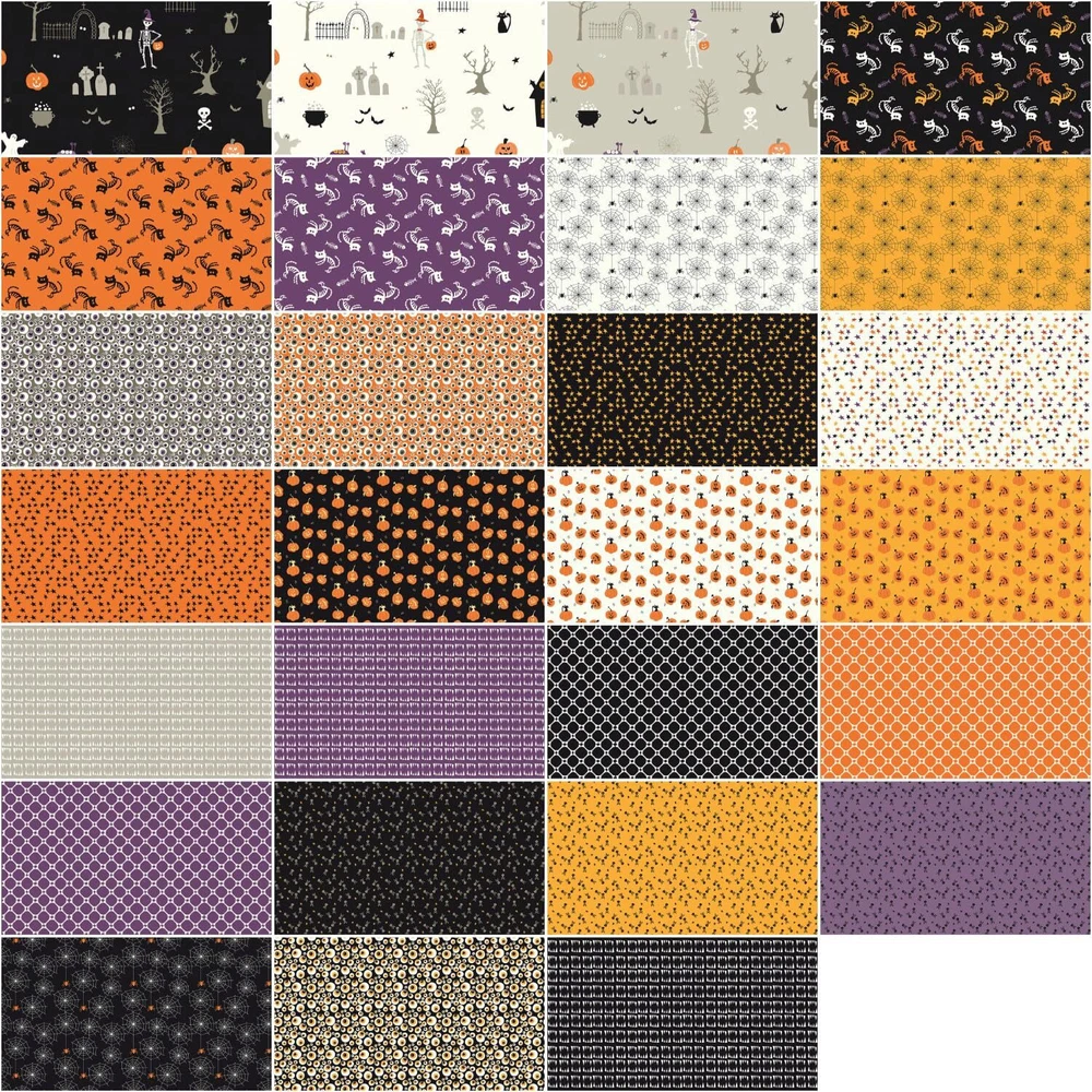 Fabric bundle of 27 18-inch by 22-inch fat quarters from the Beggar's Night collection by designer Sandy Gervais for . My mom was a lover of Halloween. My father made a giant witch in a moon. They hung said witch high up in the walnut tree in their front yard. There was a spotlight on her and you could see her for miles. Mom and her sidekick Pearl (in their 60's and 70's) always went trick-or-treating...mostly tricking. When we cleaned out the farm I inherited the witch and now I hang her in our yard. My sister suggested I do a fabric line using dad's witch. Done. Now you know the rest of the story. Featuring glow in the dark. Beggar's Night collection from Designed by Sandy Gervais Fat Quarter Bundle includes 27 18-inch by 22-inch fat quarters 100% Cotton; premium quilt shop quality fabric Featuring glow in the dark