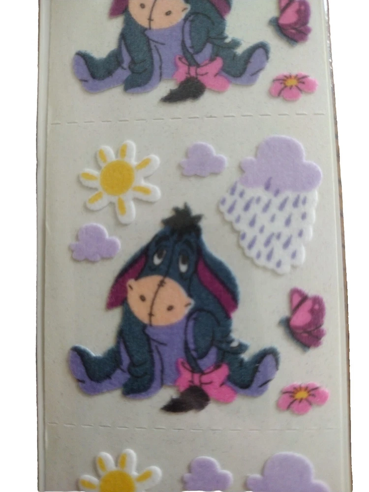 Brand new sealed Add a touch of vintage charm to your collection with these Sandylion stickers featuring Eeyore, the gloomy friend. Made in Canada, these fuzzy stickers are perfect for adding a pop of color and whimsy to your scrapbooks or other paper projects. The stickers are from a trusted brand and are sure to add a unique touch to your creations. Whether you're a seasoned collector or just starting out, these stickers are a must-have for any Eeyore fan.