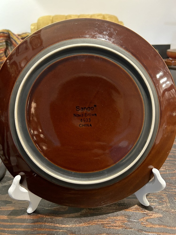 Sango Nova Brown 4933 10-1/2" Dinner Plate is a contemporary stoneware plate from America, manufactured in 2004. It features a glossy finish, round shape, and a Nova Brown pattern. This licensed reproduction plate is microwave and dishwasher safe, part of the Earth product line by Sango. The set includes one dinner plate, suitable for all occasions. Made in China, it is stackable and measures 10-1/2" in diameter. Qty 1
