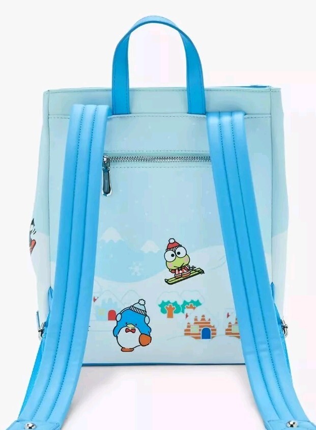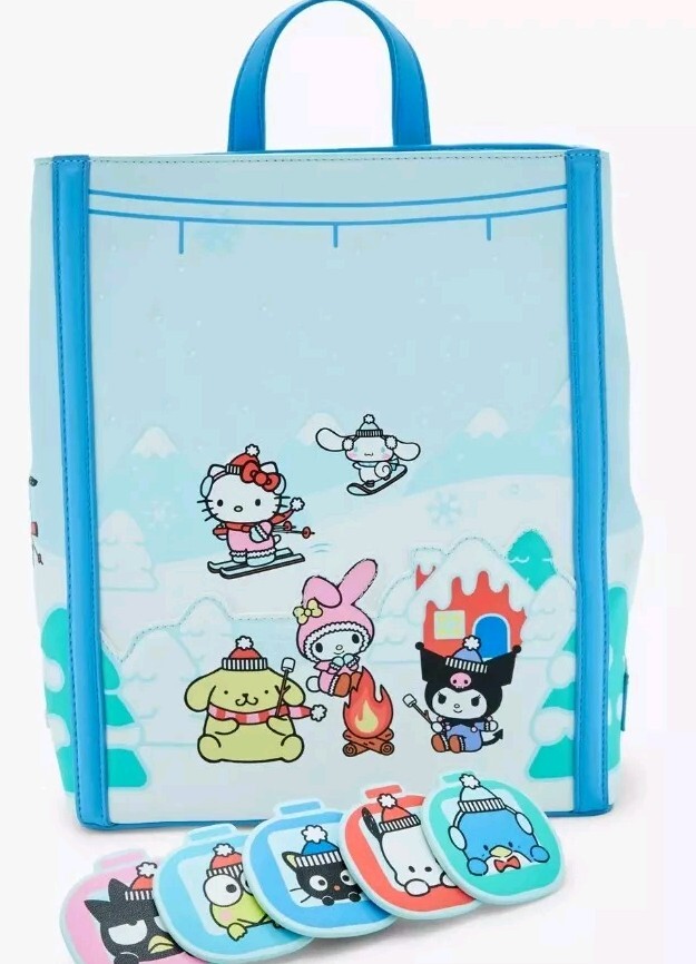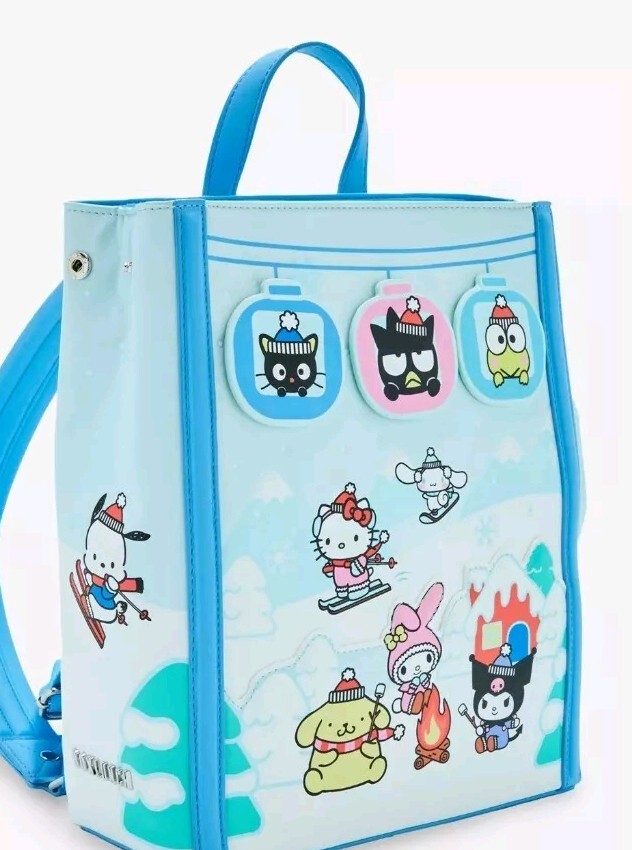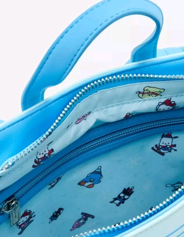 Pack up for your next ski trip with this Sanrio mini backpack! Featuring a printed design of Hello Kitty and pals enjoying the snow on the front, the back includes more Sanrio pals skiing. With removable magnetic ski lift details of Badtz-Maru, Keroppi, Chococat, Pochacco, and Tuxedo Sam, this bag is perfect for customizing for any occasion. Polyurethane