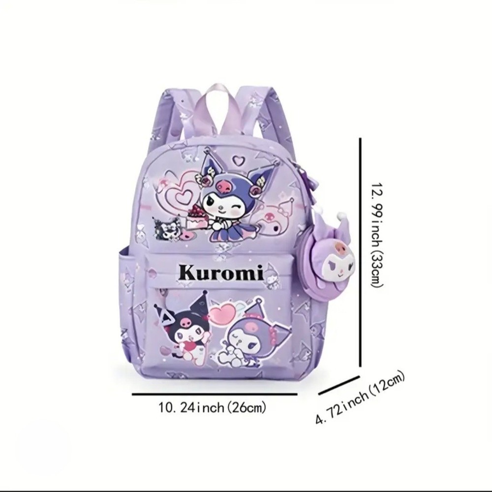 The Sanrio Kuromi Purple Kids Adult Kawaii Backpack is a medium-sized backpack featuring a cute cartoon pattern with the character Kuromi. With adjustable straps, a zip closure, and a top handle, this backpack is perfect for school and casual occasions. Made of polyester material and lined with fabric, this lightweight backpack also includes accents like a strap, zipper closure, and a character plush. Ideal for both kids and adults, this Sanrio Kuromi backpack is a fun and functional addition to any outfit. Please feel free to check out my store and bundle with other items you see and like to save on shipping!! :)