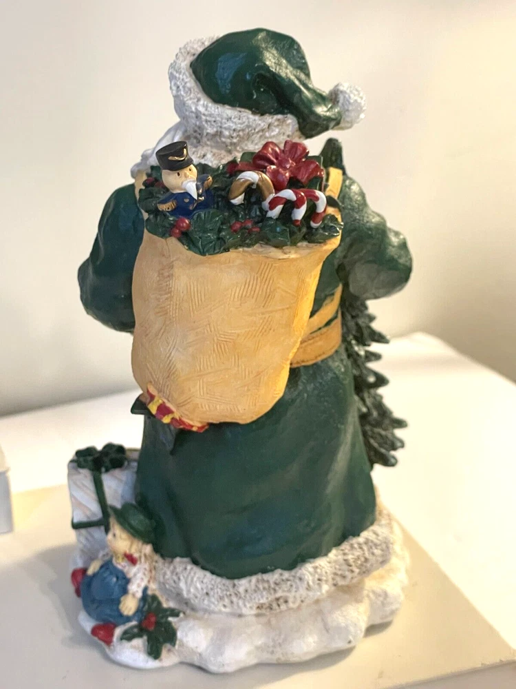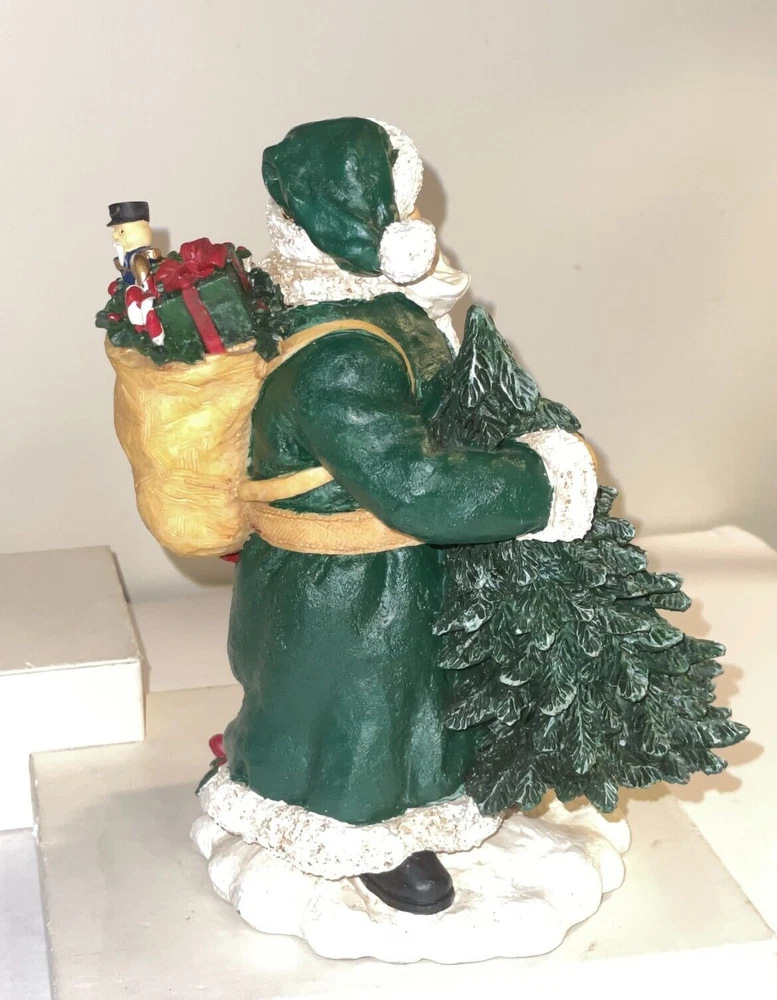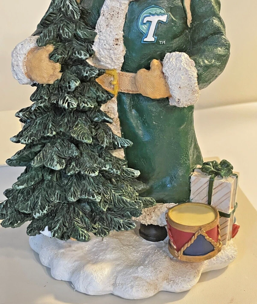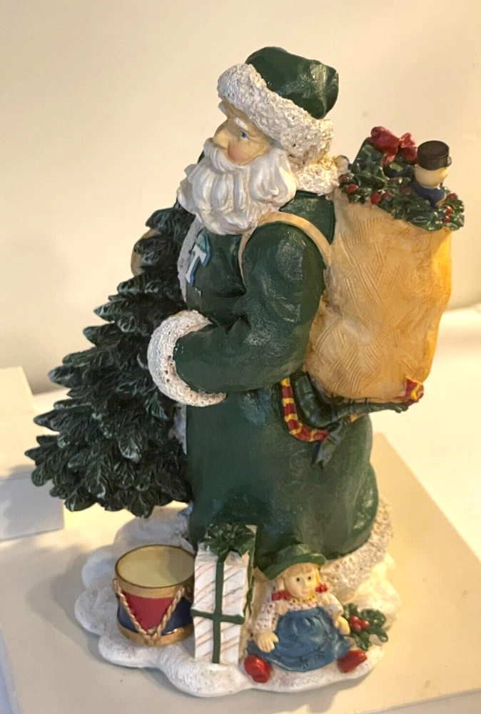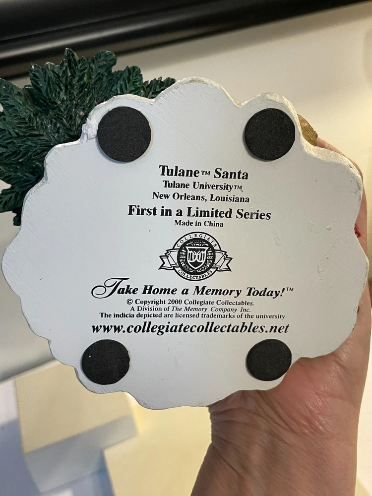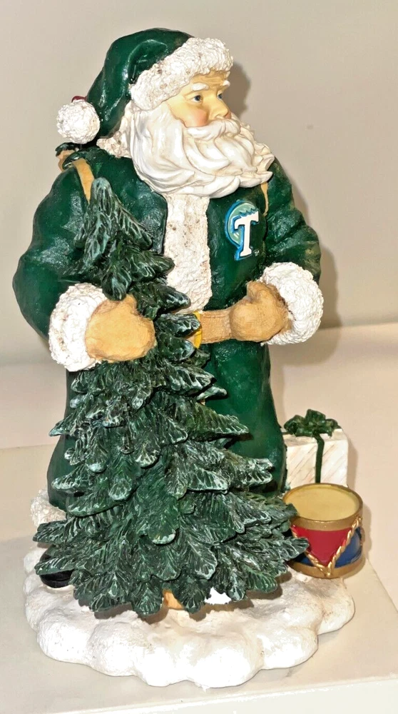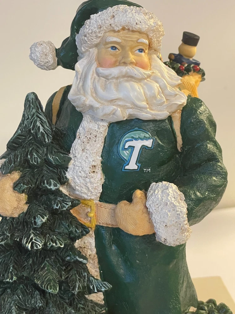 Collegiate Collectables Tulane Santa with pack and Tulane University Green Wave Logo Season: Christmas Year: 2000 First in a limited Series Santa with pack and drum, wrapped presents and carrying Christmas Tree