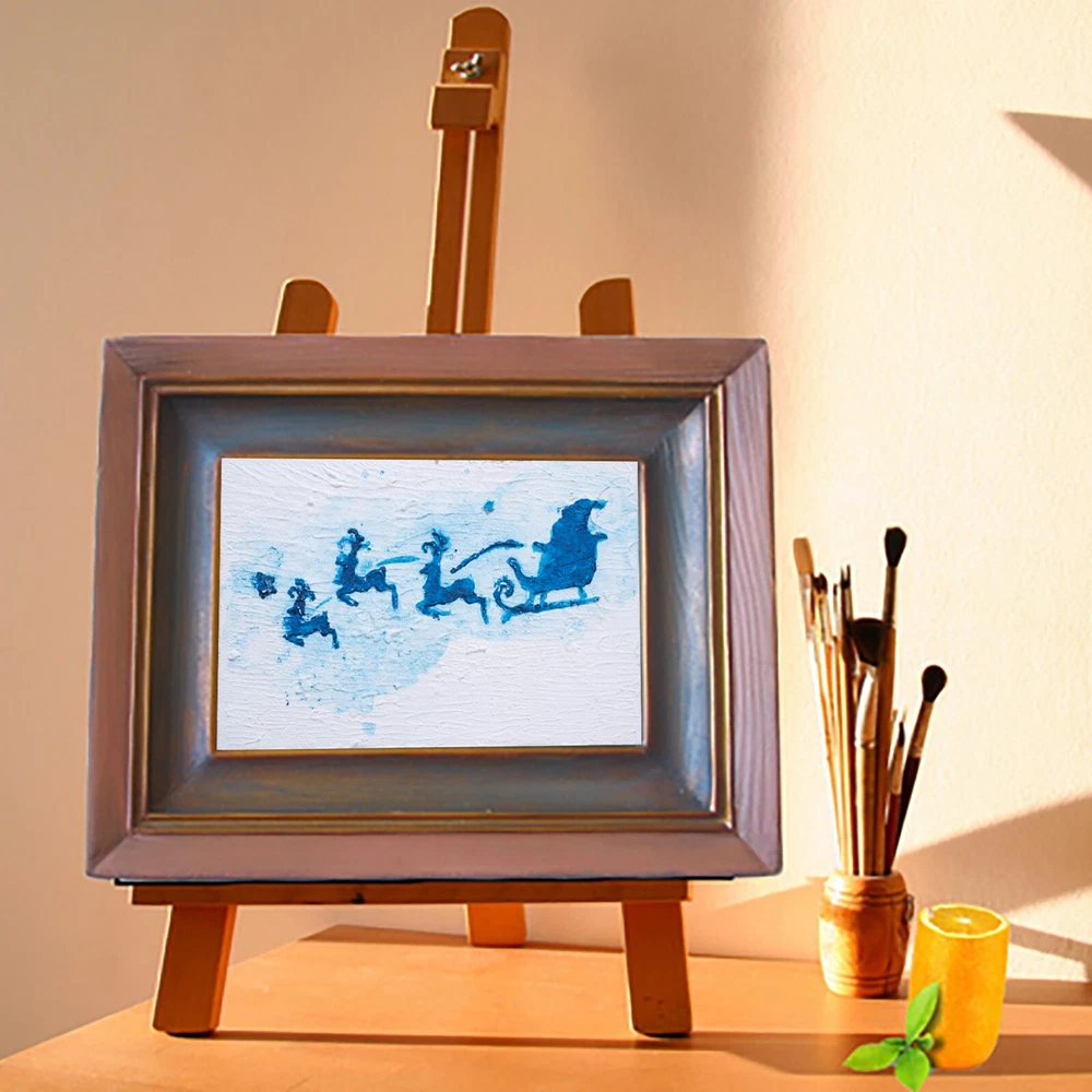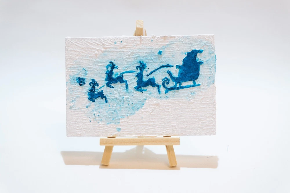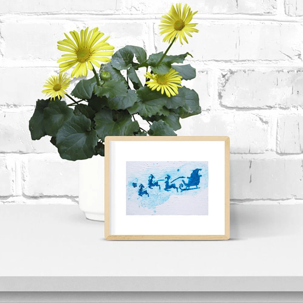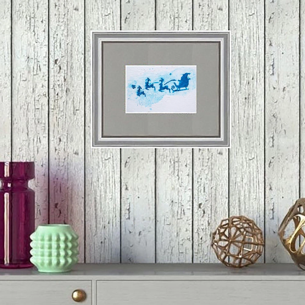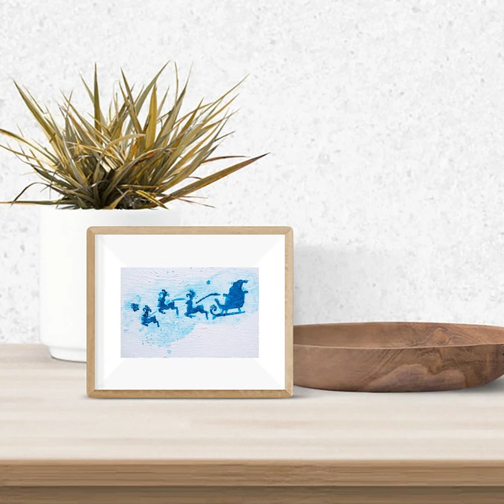 This is an original acrylic painting titled "Reindeer Sleigh Christmas" by artist Marina Fisher. The small unframed piece measures 4 inches in height and 6 inches in width. The artwork features a festive scene of Santa Claus riding a sleigh with reindeer, set in a contemporary, impressionistic style. Handmade in Oregon, USA in 2020, this one-of-a-kind piece is signed by the artist and showcases themes of holidays, Christmas, and adventure. Perfect for art enthusiasts looking to add a unique and charming touch to their space.