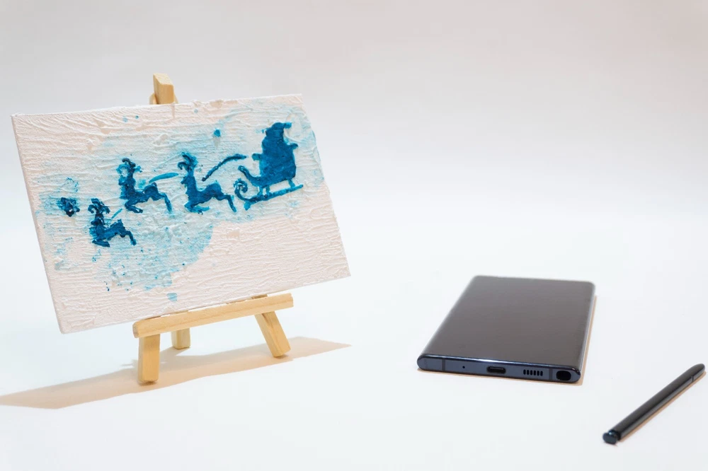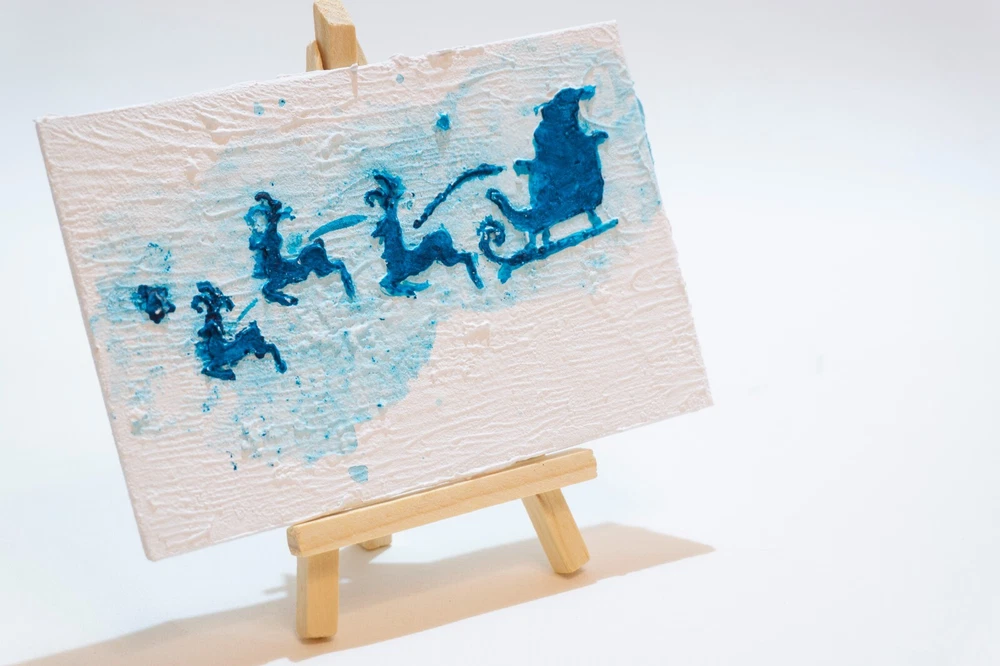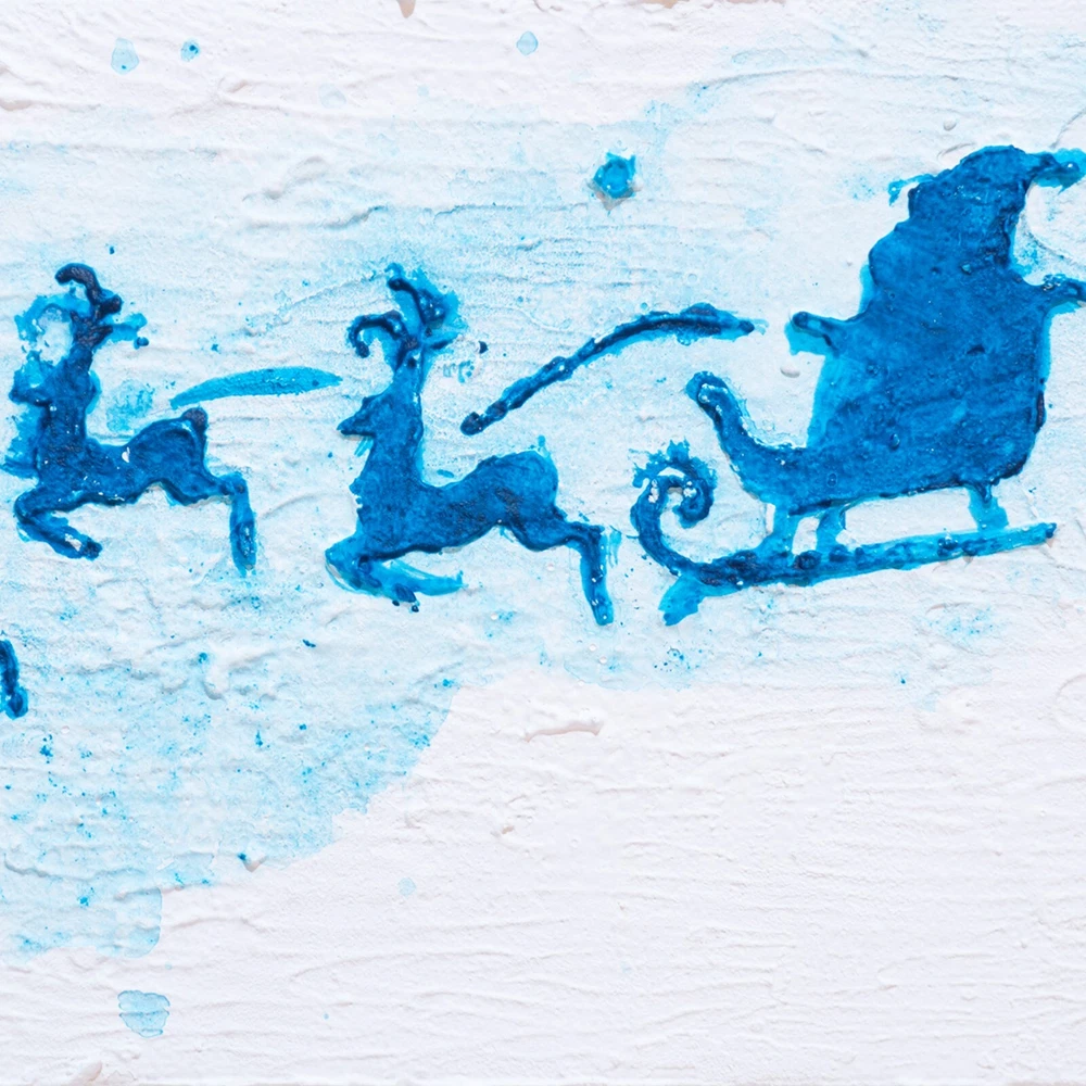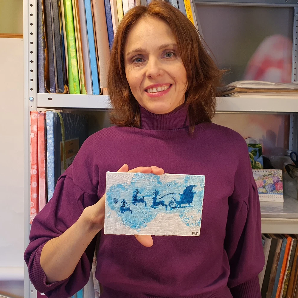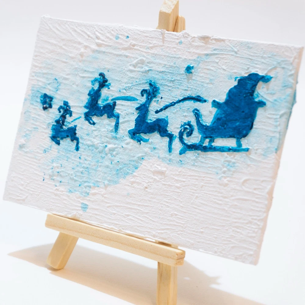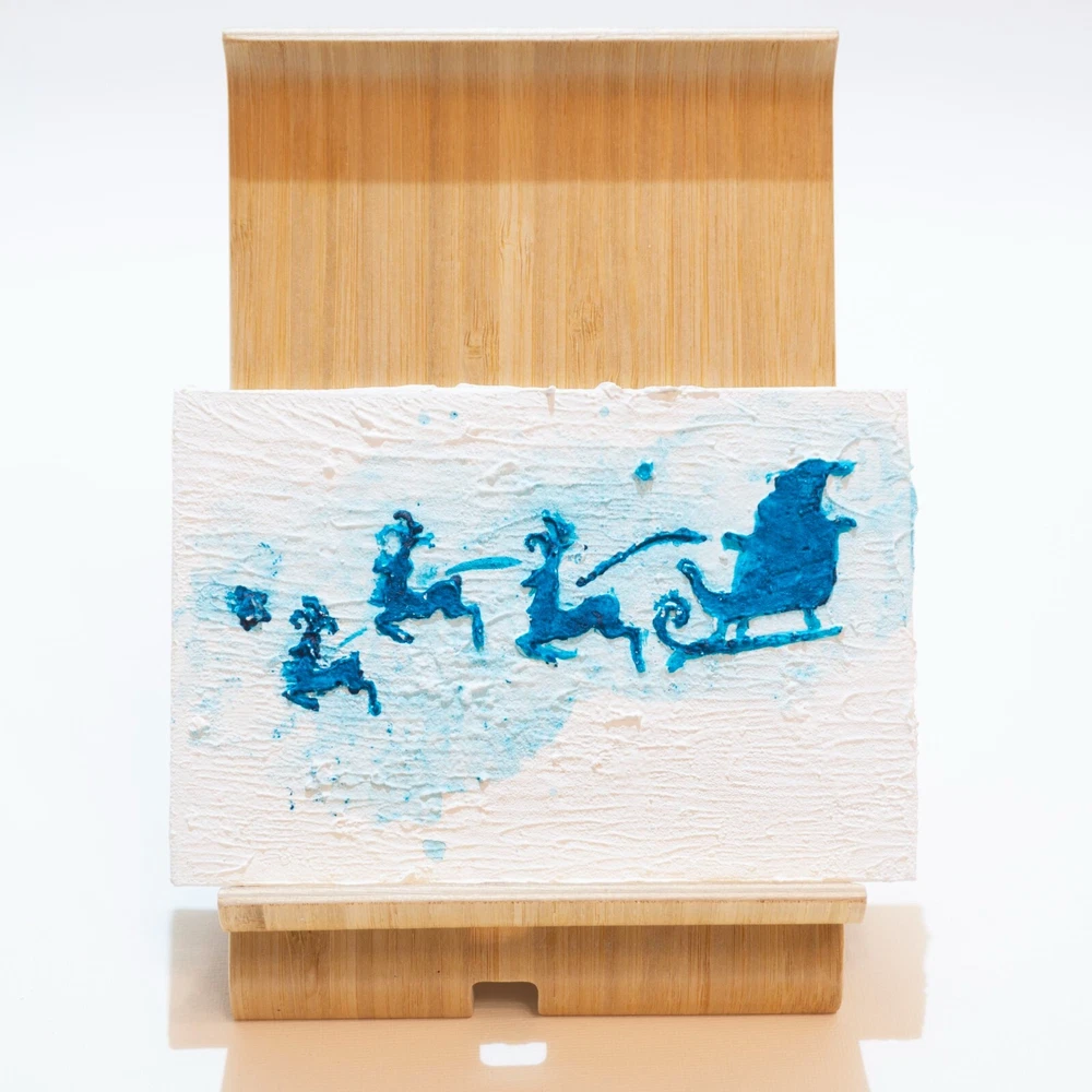 This is an original acrylic painting titled "Reindeer Sleigh Christmas" by artist Marina Fisher. The small unframed piece measures 4 inches in height and 6 inches in width. The artwork features a festive scene of Santa Claus riding a sleigh with reindeer, set in a contemporary, impressionistic style. Handmade in Oregon, USA in 2020, this one-of-a-kind piece is signed by the artist and showcases themes of holidays, Christmas, and adventure. Perfect for art enthusiasts looking to add a unique and charming touch to their space.