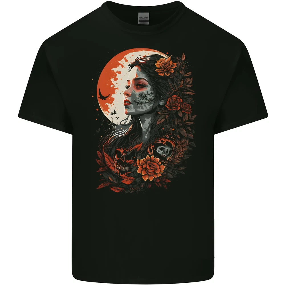 Santa Muerta & Moon Skulls Roses Mens Cotton T-Shirt Tee Top