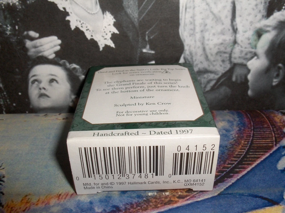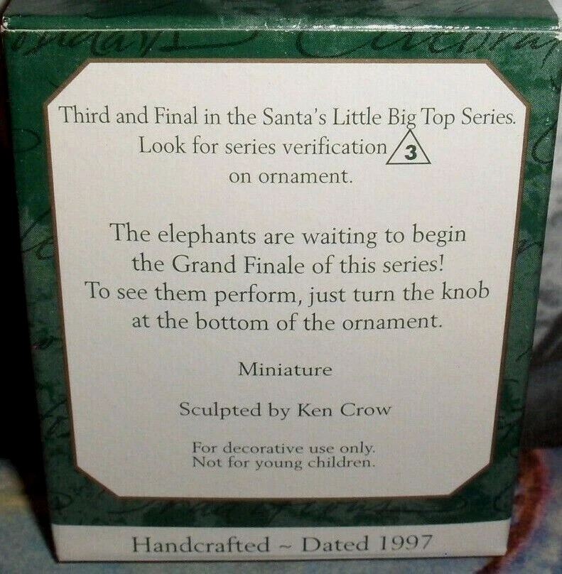 We Have For Sale One USED->Miniature Hallmark Christmas Tree Ornament.. ( 1 ) Hallmark Ornament / The Elephants Are Waiting To Begin The Grand Finale Of This Series... ( 2 ) Type / Santa's Little Big Top,Under The Carousel Roof Ornament.. ( 3 ) Collector's / This Cutie Is The 3Rd In The Santa's Little Big Top Series.. ( 4 ) Year / 1997 ( 5 ) Lighted / None, ( 6 ) Box Condition / Box Is Very Nice-Look At Pictures...Check Out Our Other Hallmarks In Our EBAY STORE.. ( 7 ) Ornament Condition / Mint In Box... SHIPPING WITH TRACKING IS FREE TO THE USA... -->>WE SHIP ALL OUR ORNAMENTS TO YOU IN BRAND NEW BOXES-NOT ENVELOPES OR SOMEONE ELSE'S SECOND HANDED USED BOXES-STAY SAFE..