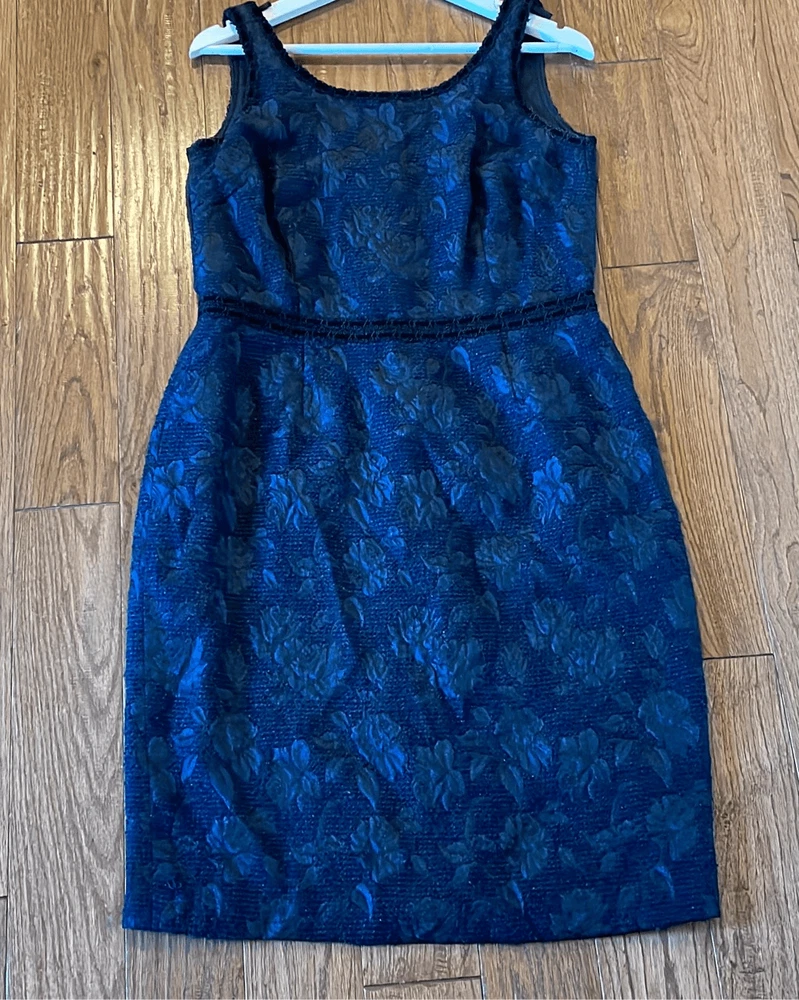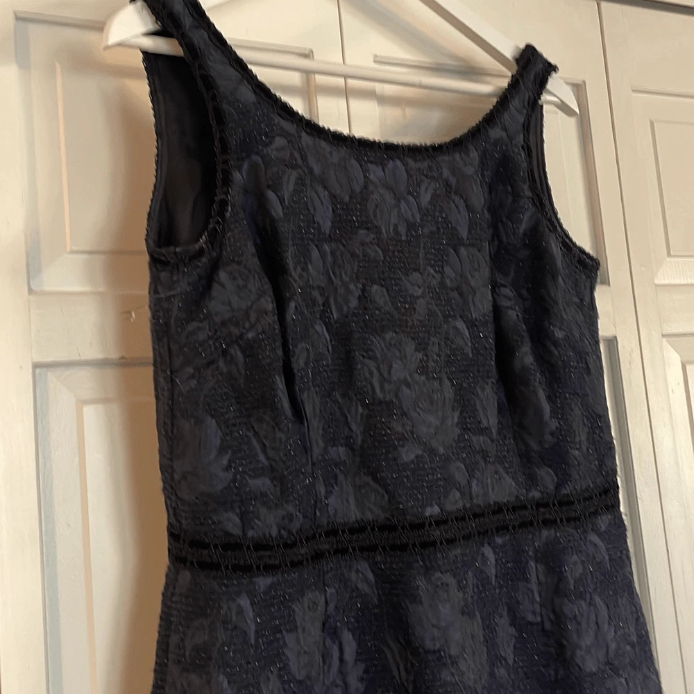 Brand: Sara Campbell Description: wool blend brocade sleeveless dress with silk lining- allover rose print with ribbon trim Size: missing size tag but measures like an 8 Color: navy and black Condition: Gently Worn Very Good ๐๐ป Measurements: Pit to pit: 18โ Length: 40โ **Bundle and Save!!** all measurements are approximate and taken laying down A12