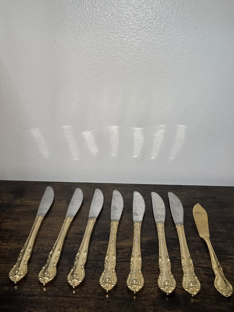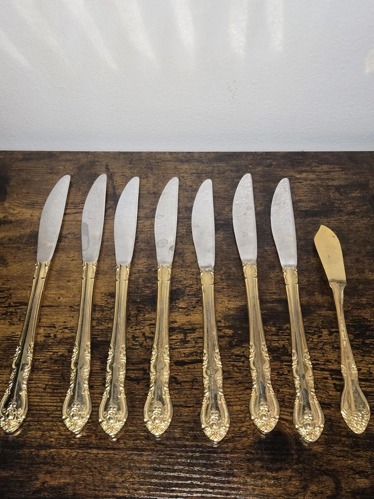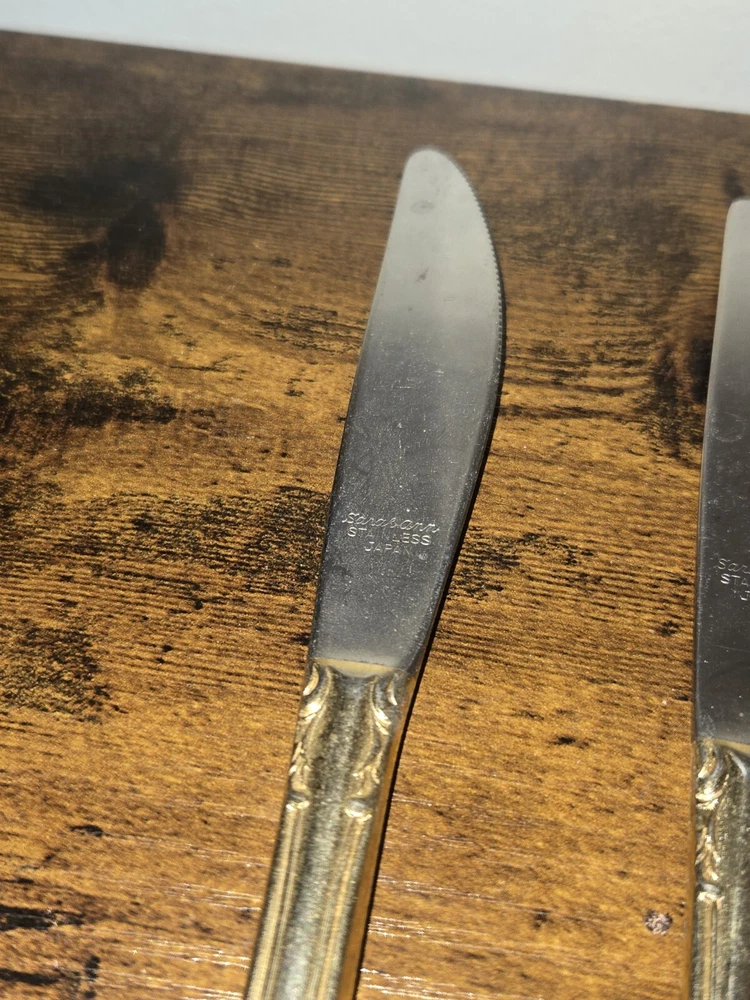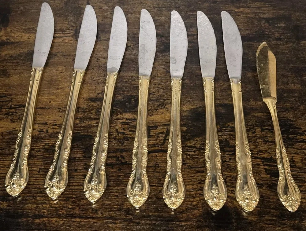 Add a touch of elegance to your dining table with this stunning set of Sarah Ann dinner and butter knives. Crafted in Japan, these knives feature a beautiful floral handle pattern on a glossy gold finish. Perfect for any occasion, these knives are sure to impress your guests and elevate your dining experience. Each set includes seven dinner knives and one butter knife, making them a great addition to your flatware collection. Whether you're hosting a dinner party or just enjoying a meal with your family, these Sarah Ann knives are a must-have. Don't miss out on the opportunity to add a touch of sophistication to your dining experience with these exquisite knives.