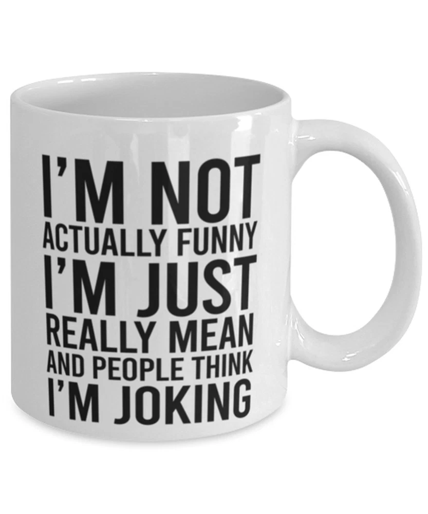 Sarcastic Coffee Mug I’m Not Actually Funny I'm Just Really Mean And People Product Details.. This high quality 11oz. ceramic white mug has a premium hard coat that provides crisp and vibrant color reproduction sure to last for years. Perfect for all hot & cold beverages. The highest quality printing possible is used. It will never fade no matter how many times you wash it. Material: 100% Ceramic. Print both sides. Dishwasher and Microwave Safe. High Gloss + Premium White Finish. Printed in the U.S.A. Personalized & Custom. We support personalized and custom mug to add custom, when placing an order, you can add notes to the "order note" in shipping address section. Also you can contact us directly via message. Shipping Info. Ready to ship in 1 to 2 business days, All products are made-to-order and proudly printed in the United States. Shipped by USPS and DHL, You will receive your order in 5-7 days. Replace & Refund. All products are defective during shipping broken, chipped will be replaced free of charge. You are not satisfied with the product, we will refund 100% money to you. If any other issues arise, please do not hesitate to message, we would be more than happy to assist you.