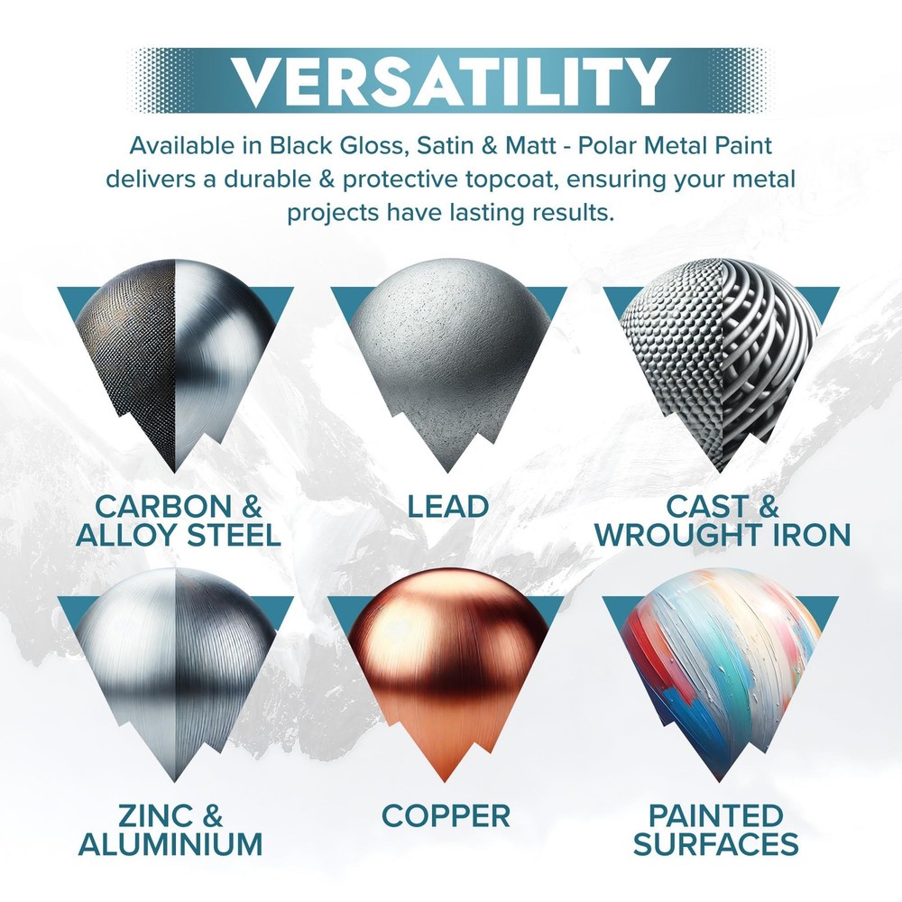 Introducing Polar Black Direct to Rust Spray Paint—the superhero your rusty metal surfaces have been waiting for! Say goodbye to rust and say hello to a world of effortless transformation and vibrant finishes. With its all-in-one aerosol formula, this metal paint spray simplifies the restoration process by acting as a primer, undercoat, and topcoat all rolled into one handy can. Get ready to unleash your creativity with Polar Black's quick-drying formula! Whether you're sprucing up rusty metal doors, garden furniture, or even gates and railings, this black gloss spray paint for metal delivers efficient, satin finishes with just one swipe. Covering up to 21 ft² per coat, it's perfect for those larger-than-life projects that demand professional-grade results. Works perfectly on multiple surfaces including wood, metal, plastic or ceramic surfaces. Ideal for rusty metal doors, interior or garden furniture, bike frame and wheels, car parts (alloys), motorcycle parts, tools, ornaments, metal gates, fences & railings. But wait, there's more! Polar Black isn't just about looks—it's a powerhouse when it comes to protection. With its unparalleled defense against rust and corrosion, it works as a rust prevention spray for your metal surfaces! Plus, it's suitable for both indoor and outdoor projects, ensuring your creations stay looking pristine for years to come. And the best part? Applying Polar Black is as easy as pie! Simply spray directly onto metal for excellent coverage and lightning-fast drying times. With just 2-3 light coats, you'll achieve flawless results that dry to the touch in just 20 minutes. Say goodbye to boring, tedious restoration projects and hello to fun, effortless transformations with this black metal spray paint! So why settle for dull and boring when you can add a splash of color and excitement to your metal projects? Choose Polar Black Direct to Rust Spray Paint and let your creativity shine! Say hello to vibrant, corrosion-free masterpieces and make every project a work of art! Rust Remover Spray Paint: Our specially designed Polar Matte Black Direct to Rust spray paint is an aerosol anti rust paint for metal formulated to act as a primer, undercoat & topcoat. Giving high performance on quick solution restorations against rusting metals or furniture as well as wood, plastic and ceramic surfaces. Long-Lasting Protection: Polar Direct to Rust black spray paint for metal actively defends & protects against rust & corrosion. Our metal spray paint provides excellent adhesion to ferrous and non-ferrous metal substrates, making it perfect for indoor & outdoor surfaces, offering excellent resistance to UV, salt spray, and color fade. All Purpose Use Interior & Exterior Projects: Take our rust prevention spray on any interior or exterior DIY projects. Works perfectly on multiple surfaces including wood, metal, plastic or ceramic surfaces. Ideal for rusty metal doors, interior or garden furniture, bike frame and wheels, car parts (alloys), motorcycle parts, tools, ornaments, metal gates, fences & railings. Easy to Use & Quick-Drying: Our rust inhibitor spray is the go-to choice for pro or DIY enthusiasts with its easy-to-use spray can. With its quick-dry formula, apply sparingly from a distance of 15-25cm, one can covers 2 ft². Leave to dry in 20 mins. Re-coat after 20 mins for an enhanced finish. Attractive Finish & DIY Friendly: Our metal paint spray leaves an attractive gloss finish. Apply directly to metal for a tough and durable finish, effectively reviving old items, providing a renewed appearance and extended quality.