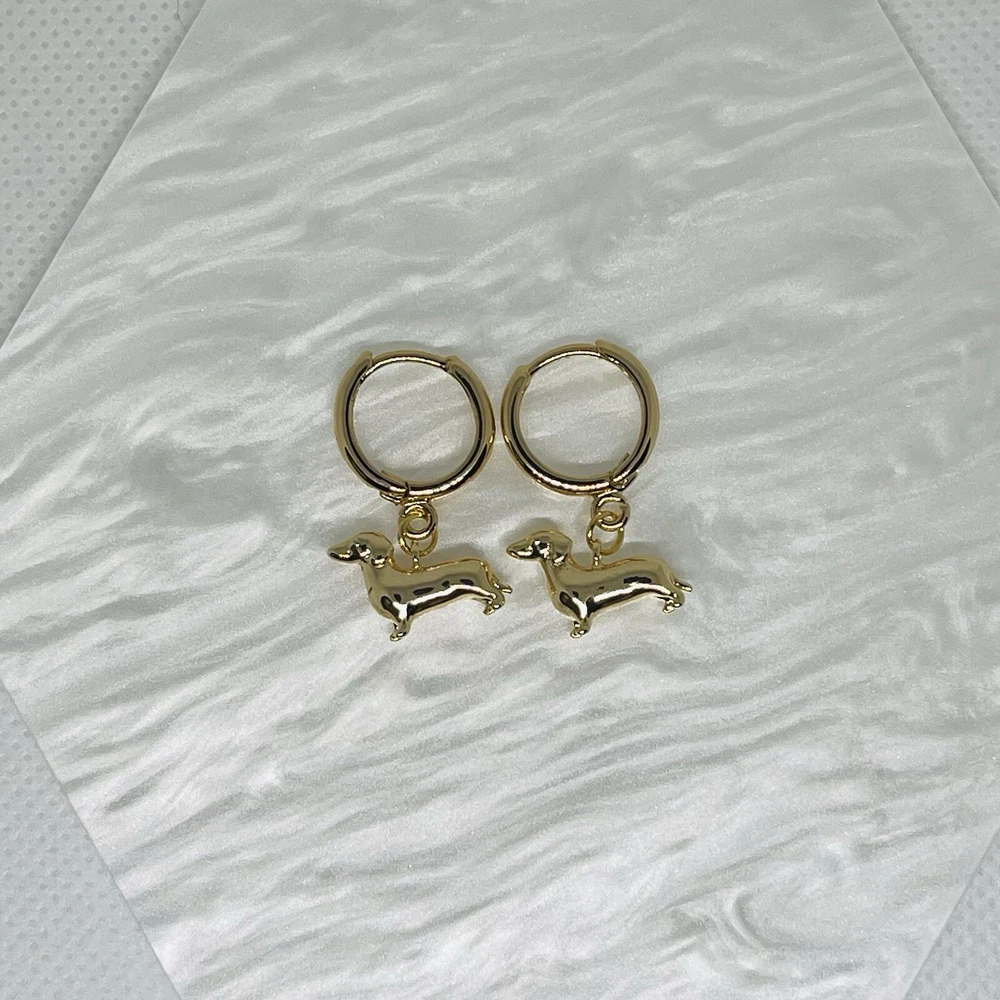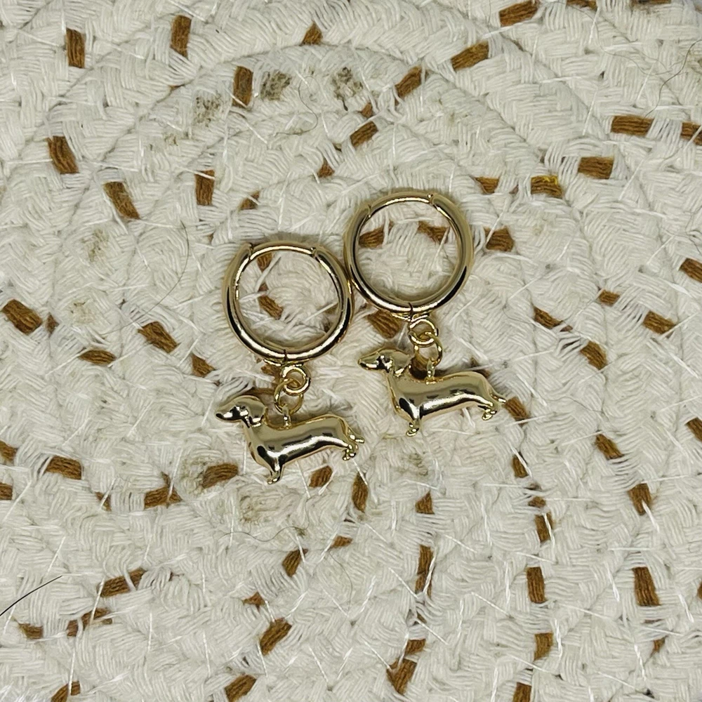 Add a touch of fun and quirkiness to your jewellery collection with these adorable Sausage Dog Hoop Earrings. The earrings are beautifully crafted with a yellow gold plating and feature a cute sausage dog design that is sure to make you smile every time you wear them. These earrings are perfect for those who love unique and eye-catching accessories. They are ideal for adding a pop of colour and personality to any outfit, whether it's a casual day out or a special occasion. The earrings come in a gorgeous gold colour that will complement any outfit. Get ready to turn heads and make a statement with these delightful Sausage Dog Hoop Earrings.