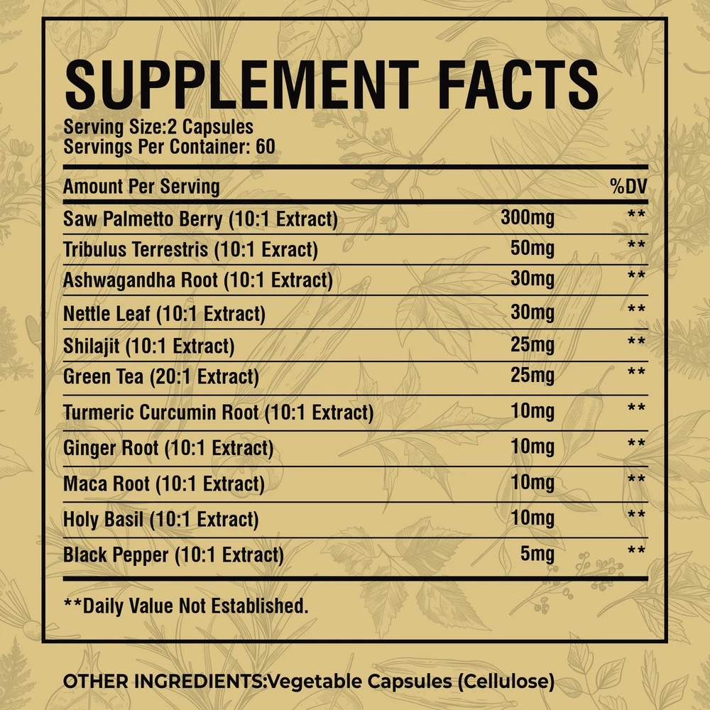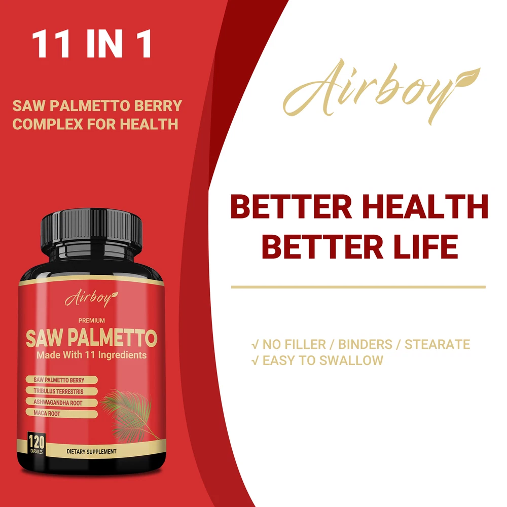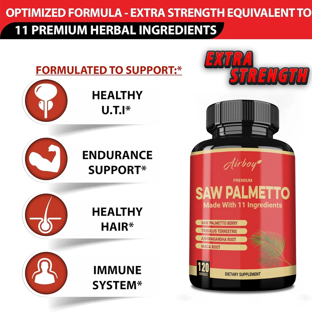 Effects: Energy & Endurance, Testosterone Booster Ingredients: Saw Palmetto,Tribulus Terrestris,Ashwagandha Directions: Take 2 capsules once daily after a meal. Shipping: Ships within 48 hours on working days. Shelf life: 2 years Description: Potent Saw Palmetto Berry Supplement, with Saw Palmetto Berry, Ashwagandha Root, Turmeric Root, Holy Basil (Tulsi), Black Pepper, Shilajit Powder, Nettle Leaf, Green Tea, Tribulus, Maca Root; boosts wellness. 11-in-1 Extra Formula Booster, High Absorption Saw Palmetto Berry Supplement; supports optimal prostate, calm mood, immune system and energy production for men and women. Herbal Saw Palmetto Complex maintains movement balance and a healthy lifestyle. Gluten Free, Non-GMO, Plant-Based, Keto-Friendly, Vegan. Document