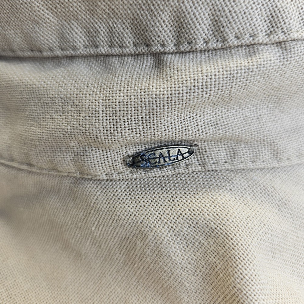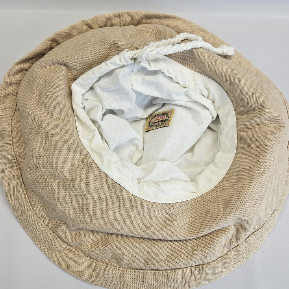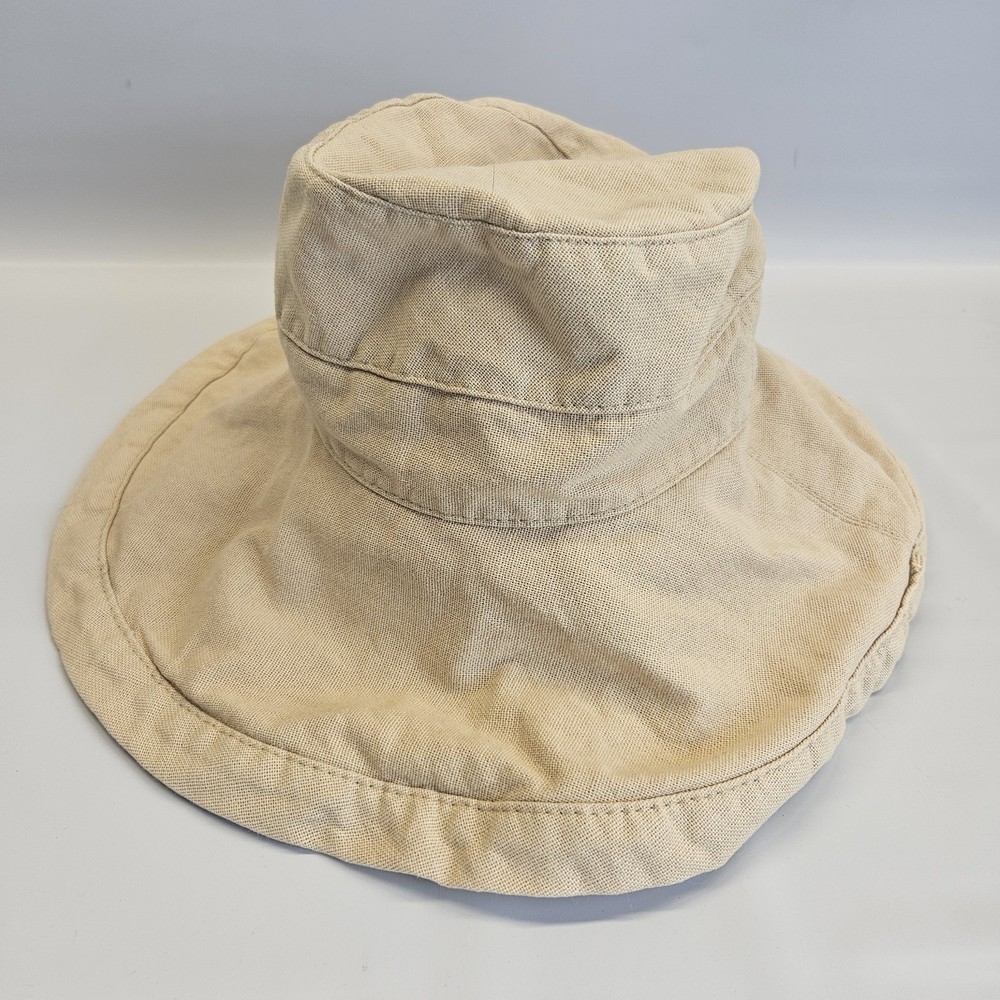 Scala Collezione Khaki Tan Canvas Bucket Beach Sun Hat Adjustable Floppy Cotton Good preowned condition with some staining on the lining. This hat has been washed and air dried.