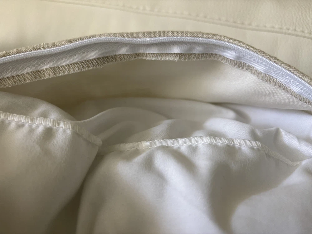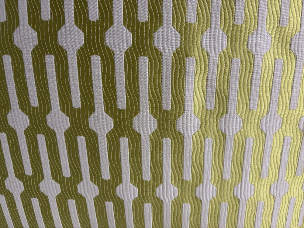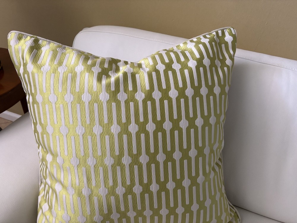 This pair of Scalamandre pillow covers features a geometric square design in beige and kiwi colors, made of silk/linen material with embroidered details. Measuring 24x24 inches, these decorative pillow covers have a modern multi-style and a hidden zipper closure for easy maintenance. The custom Scalamandre brand ensures high quality, and they are suitable for various rooms like the office, bedroom, living room, lounge, guestroom, or dining room. These are meticulously made by me in my workroom. Have worked for designers and had my own workroom. They have self welting, serged edges to avoid fraying and invisible zippers. - backs of pillow cover are of fine lined tan linen Measuring-20x20 Recommend hand wash Inserts not included Quantity- 1 pair