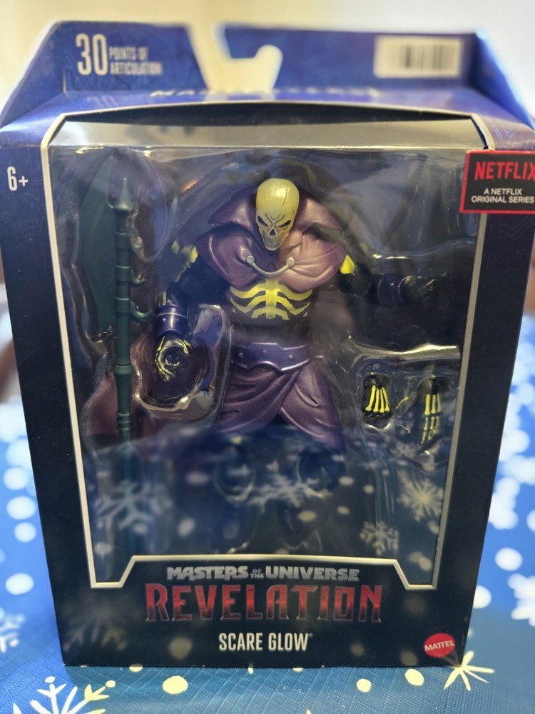 UNOPENED NIB The "Scare Glow" figure is a 1:12 scale action figure of a Merman character from the "Masters of the Universe" franchise, specifically from the "GLOW" TV show on Netflix. Made of PVC/plastic material, this multicolor figure stands at 7 inches tall and comes with clothes, packaged in a box. Produced by Mattel, this original item is part of the Masters of the Universe Revelation series, with a model number of MTHDR33. It also features a boxing sport theme.