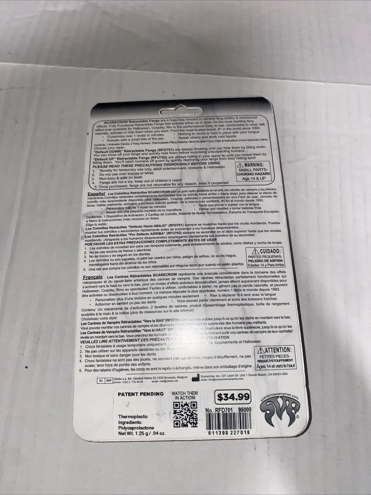 Scarecrow Retractable Fangs Halloween Costume Accessory. Condition is New with tags. Shipped with USPS Ground Advantage.